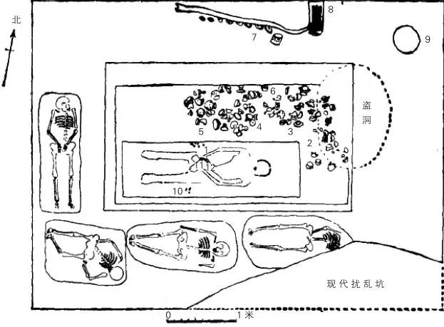 1. 石贝 2. 陶鼎 3. 陶簋 4. 陶豆 5. 陶罐 6. 铜提梁卣 7. 铜编钟及木支架 8. 木琴?9. 木鼓?10. 石饰 11. 铜勺 12. 石玦、玉玦