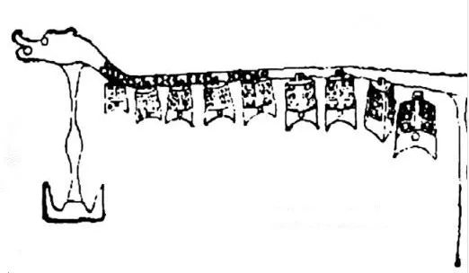 簨簴,也作“笋簴”,指古代悬挂钟罄的支架。乐悬制度与簨簴密切相关,同时簨簴也是判断乐悬是否为明器的标志之一。柳格庄 M6 也出土有簨簴,为两端双立柱,高约 75 厘米,立柱中部略粗,底部为“山”字形座。横梁较长,左端为龙头形,短角,上下唇皆上卷 ;右端被另一木器所压,形制不明。梁总长约 1.8 米,宽约 5厘米,着红漆,上绘黑色曲尺纹,若鳞状。