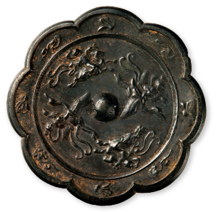 馆藏唐代铜镜的纹饰以海兽葡萄纹、花鸟纹、宝相花为主,铜镜形状多样,如葵花形、菱花形。海兽葡萄纹镜流行于盛唐、中唐时期,为唐代独有的镜类。海兽代表祥瑞,指外来的狮子。“海”代表中国古代的一种地域观念,因为这些动物不是本国所有,而是来自疆域之外,故在前面加“海”。葡萄,又作蒲桃,汉武帝时张謇出使西域带回中国并引种成功,唐代时期广泛种植,具有多子多福象征意义的葡萄纹饰也随之流行开来。花鸟纹、宝相花镜流行于盛唐、中唐时期,花鸟纹饰自由灵动,华丽多姿,展现出一派生机勃勃的景象,也充分反映出唐代人对生活的热爱。宝相花是将某些自然形态的花朵(主要是荷花)进行艺术处理,变成佛教艺术中特有的花卉形象,既有吉祥美好的寓意,也体现出唐代崇佛、礼佛的社会背景。