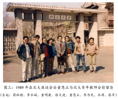 1984 年,国家文物局首届考古汇报会在成都举行,夏鼐、苏秉琦等大佬云集蓉城,经童明康引荐我与童先生相识。后来我和他提起分到川大的事,他听后极为震惊,说他们一直想要北大学生,怎么要到了又给退了。我重返北大后,每年寒暑假回四川都会找机会去他家里拜访,听他摆龙门阵、坐而论道是种享受,也能切身体会到他的绝顶聪明。他对我影响很大,我也在某些方面以他为师。1989年春,我请他来北大考古系与青年教师、研究生座谈,严先生作为老同学也来作陪。我的开场白是:“童先生是考古界的一只怪鸟”,引发全场大笑,他也笑了。座谈时他讲话风趣幽默,言辞锋利睿智。以其亲身经历例举了考古界的一些怪现象,包括 1979 年他兴冲冲地去西安参加中国考古学会的成立大会,因不在名单之内不准参会。还有 1982 年他与张光直先生谈好的合作项目竟被强行中止……糟糕的是,后来让学生整理的座谈会录音带竟然丢失,这让我一直感到内疚。