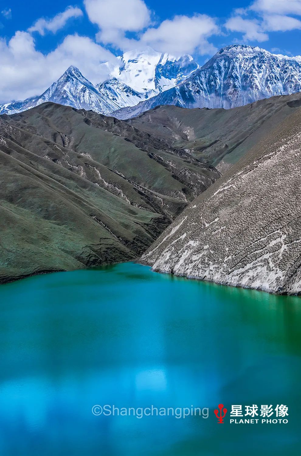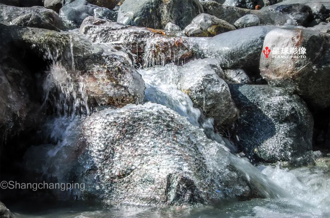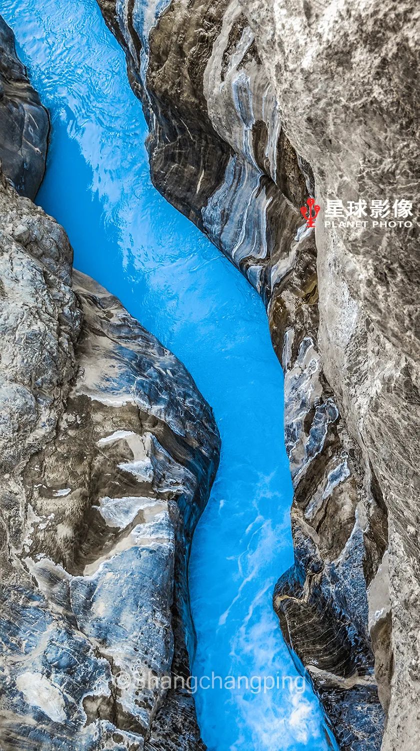 ▼ 克里雅河上游海拔4000米,泛着蓝光的雪山融水流出深涧