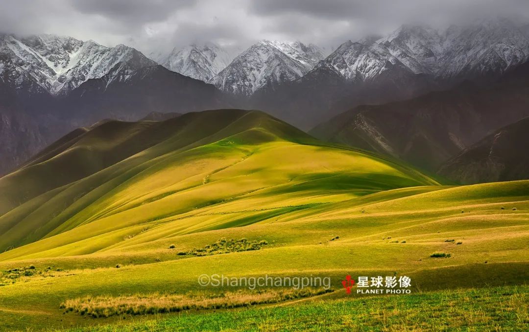 于田县境内峰峦叠积,海拔6000多米的乌斯腾塔格山峰终年积雪,站在山中,眼前冰川如银梭穿行于高山之间,又似一幅绘有玉树琼枝的绢帛临风摇曳。每到秋季,高山草甸以丰富的色彩填满了三维空间,颜色变化随着山风产生动感,像是一面巨大的五彩风帘悬挂在昆仑山上。