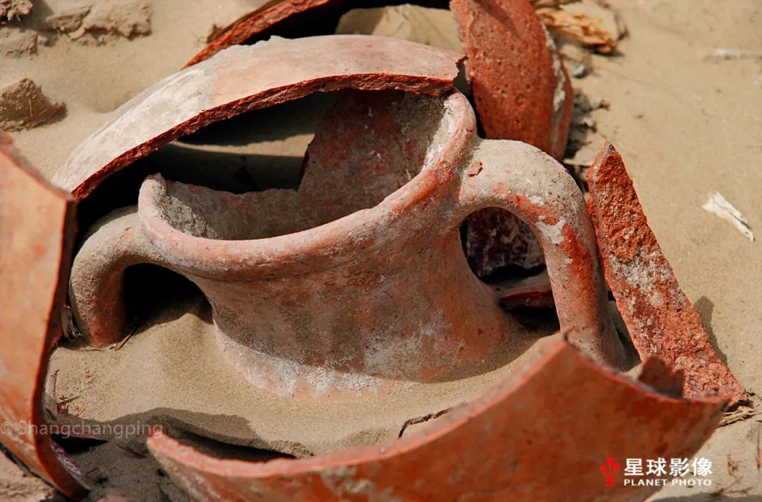 ▼ 喀拉墩遗址内散落的陶瓦罐碎片