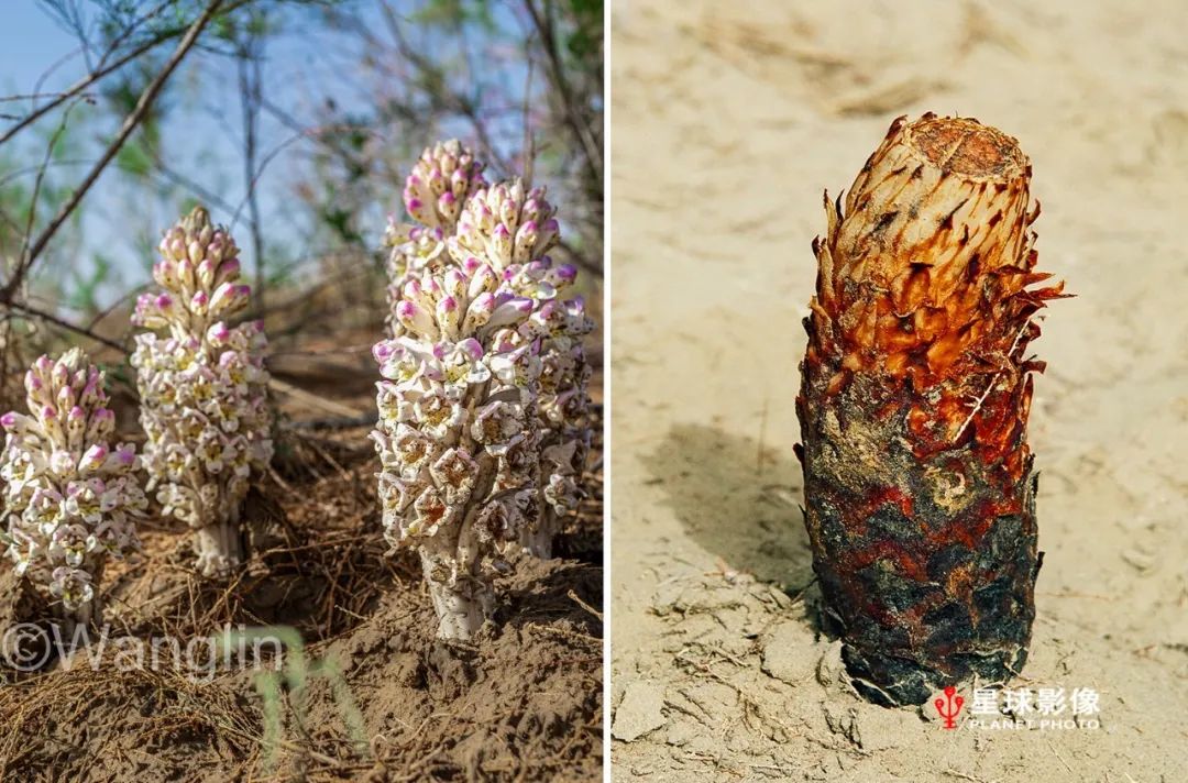 ▼ 沙漠中的肉苁蓉开花了(左图),成熟的肉苁蓉果实(右图)。肉苁蓉是一种生长在沙漠树木梭梭、红柳根部的寄生植物 @摄影师 王林