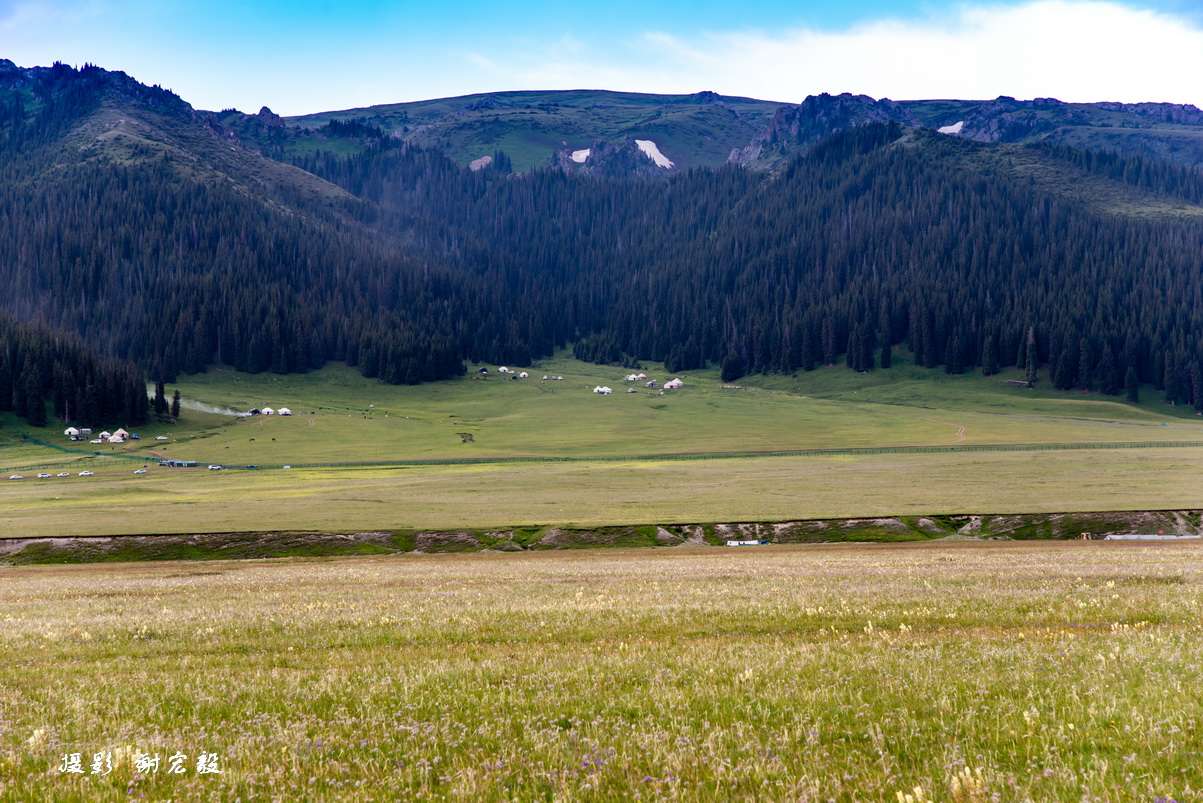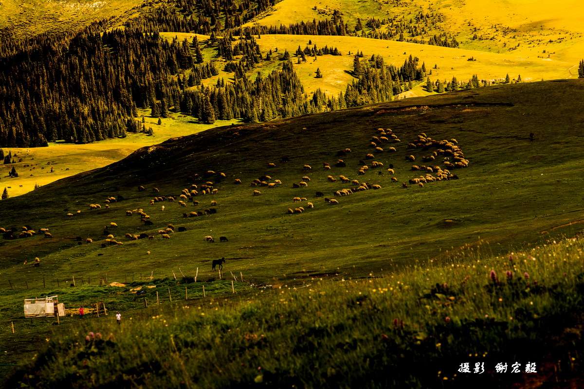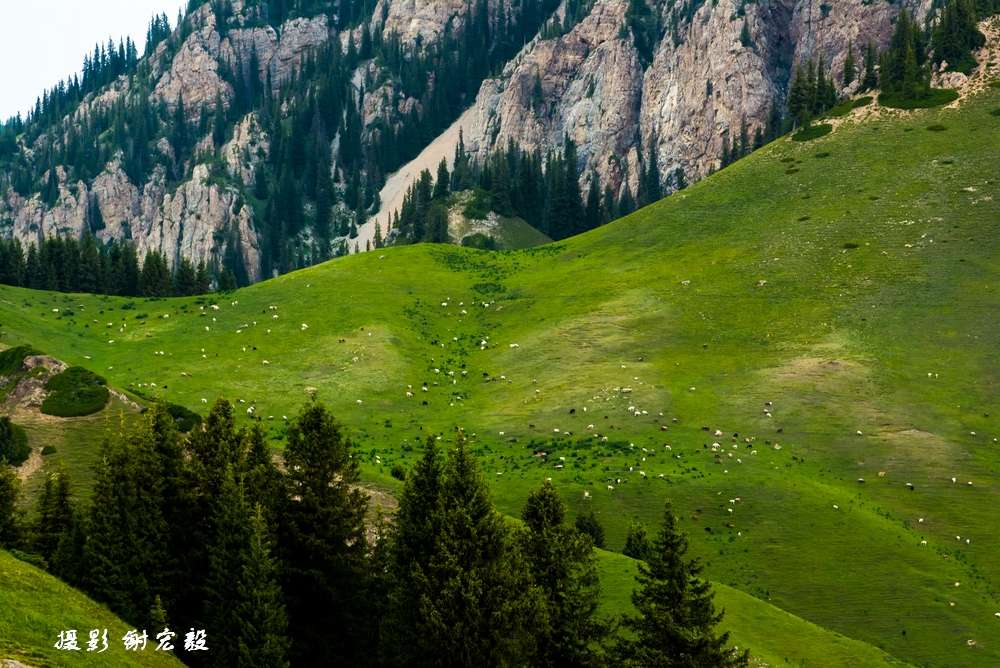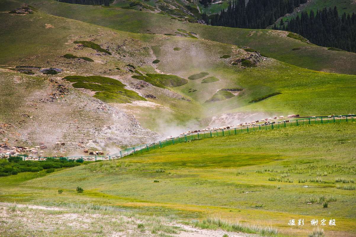 果子沟里的高山牧场。不必风吹草低见牛羊,站高处看就可细数山坡上羊儿,当然数来数去数不清那是你的事了。
