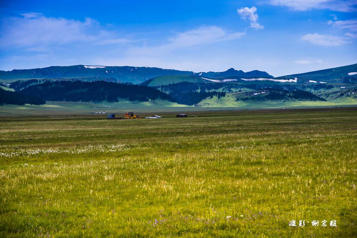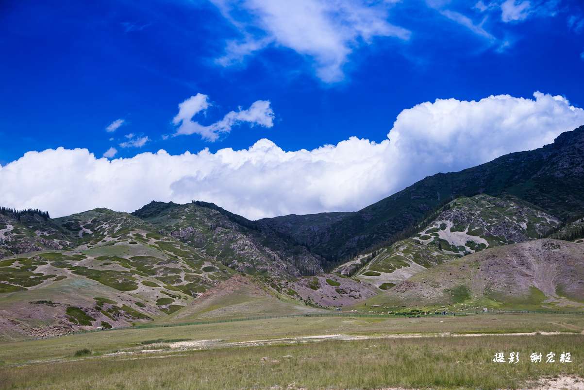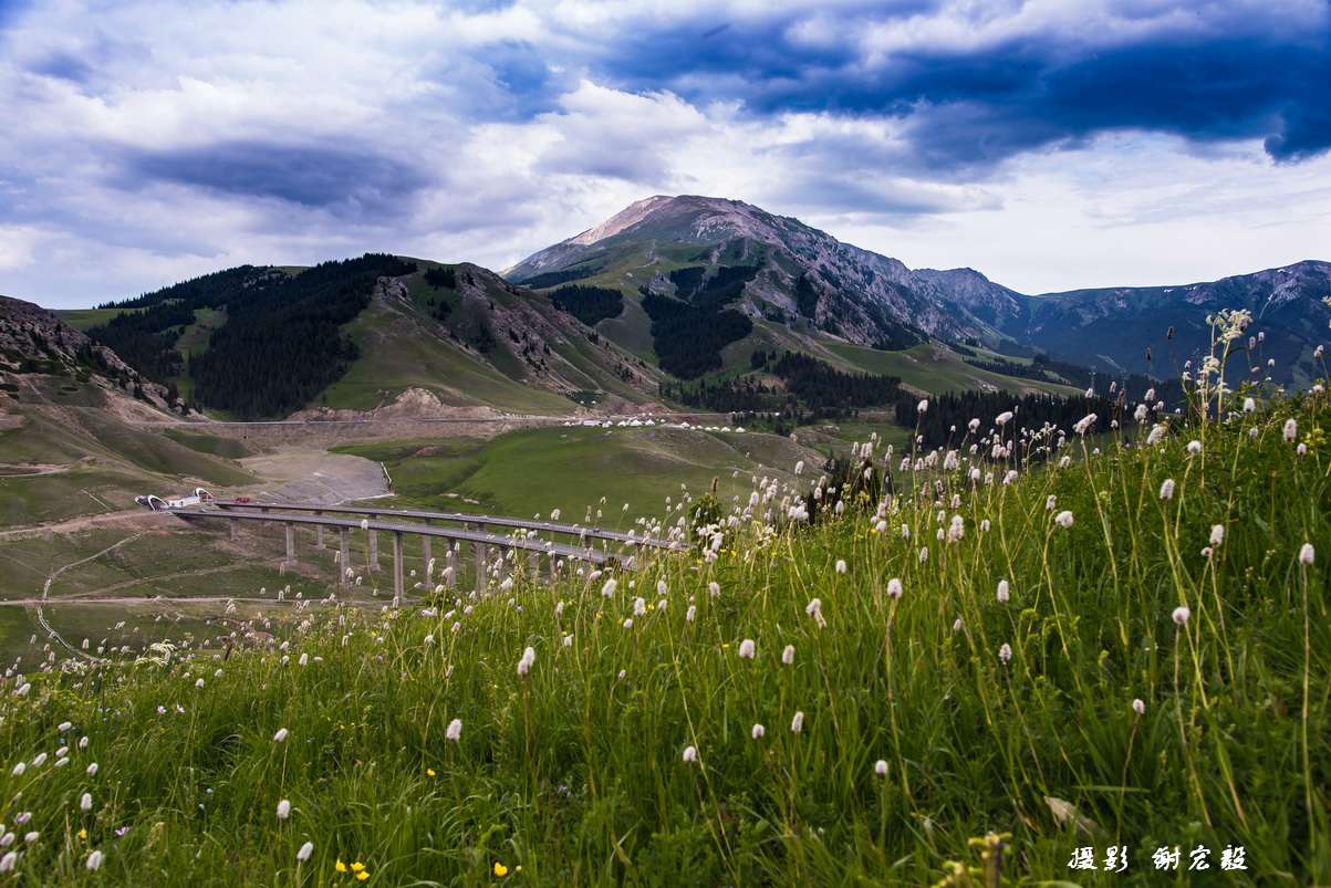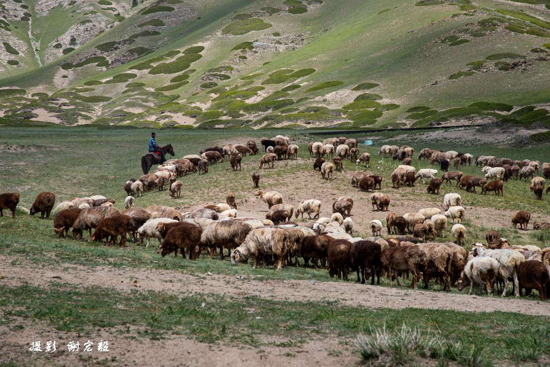 果子沟里的高山牧场。不必风吹草低见牛羊,站高处看就可细数山坡上羊儿,当然数来数去数不清那是你的事了。
