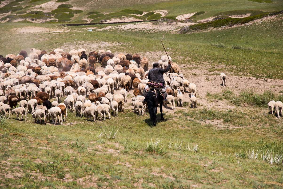 远处的沙尘提示我们,那是一群放牧的羊群。到近处一看,不出所料,牧羊人见我们的相机,一时兴起,不时扬起手中的鞭子在空中飞舞。
