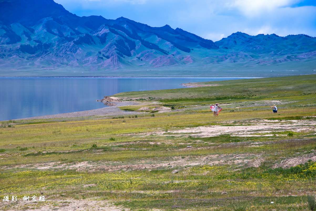 回到湖边,远远可见游客在草地上扬起纱巾摆出各种造型,且不管人长的模样,反正能点缀画面就好。