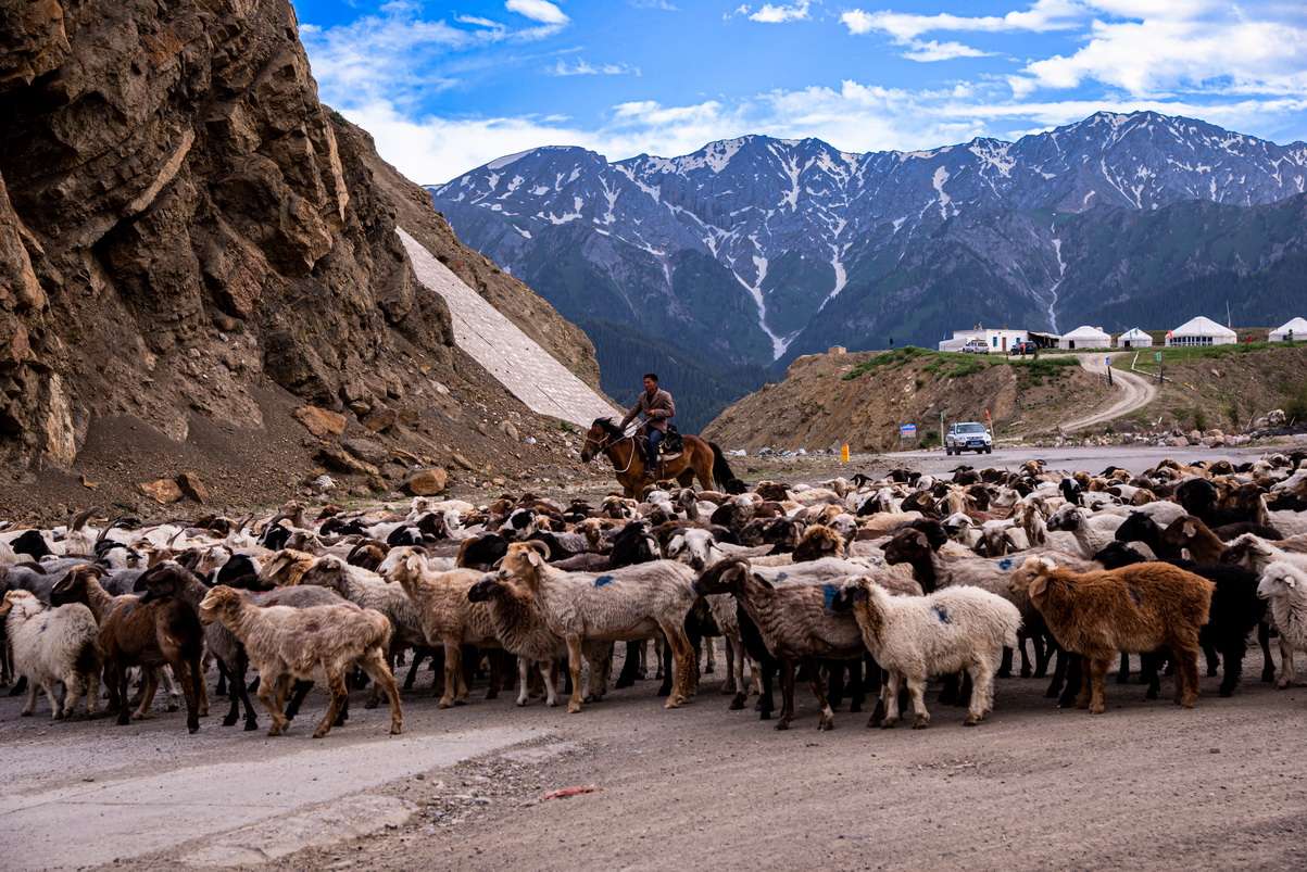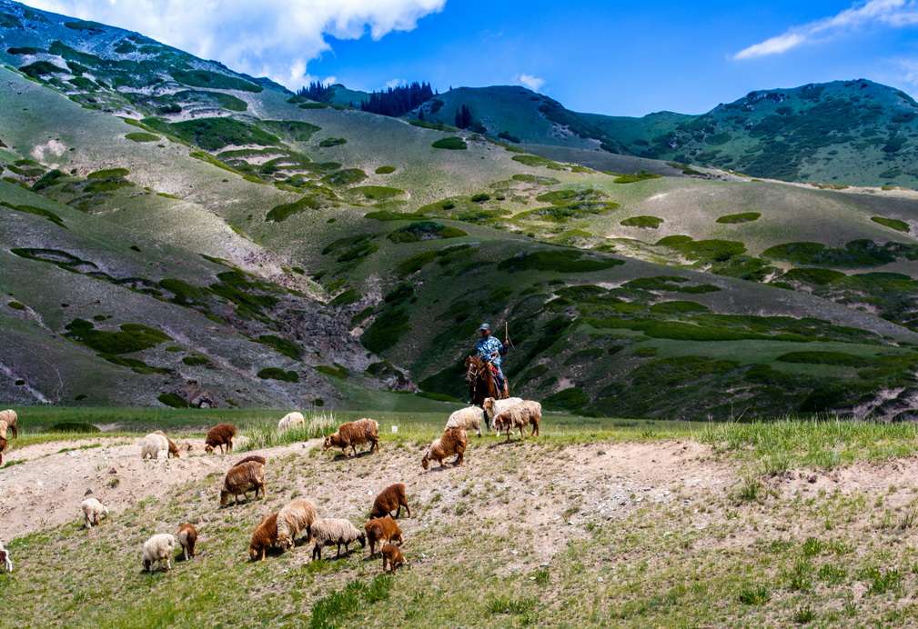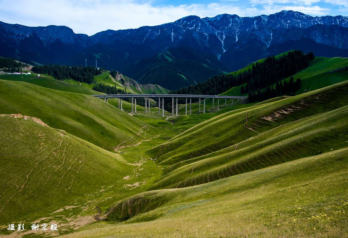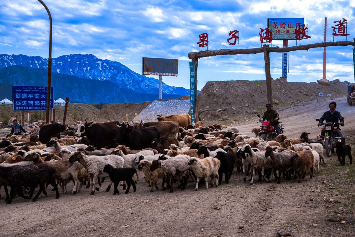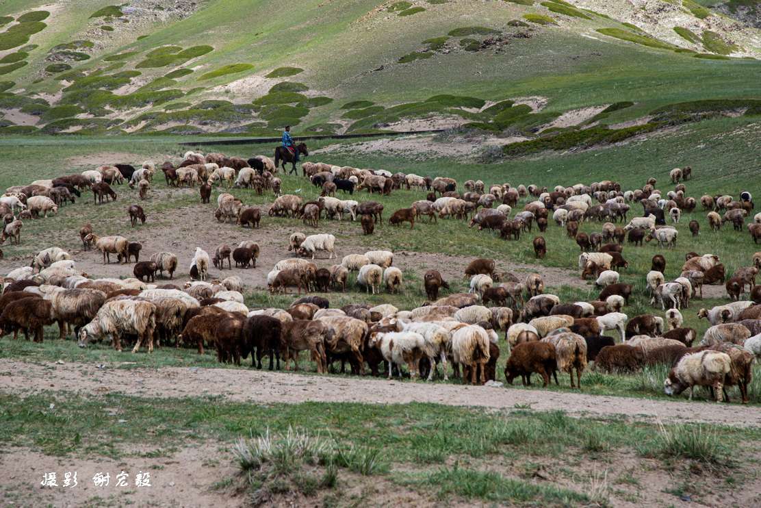 下一站是果子沟,司机老张说要带我们去一个制高点,从那可以拍摄果子沟大桥的全貌。车刚沿公路上到山顶就被一大群从果子沟牧道出来的一大群羊给拦在路上。在新疆,这牛羊群比天大,在路上遇到,你再大的车也没辙,得给牛羊群让路。为了让车辆通行顺畅,又在牧场间专门修了果子沟牧道。