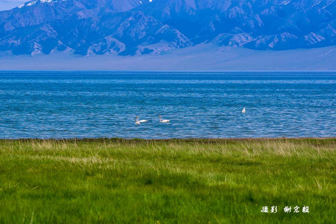 湖边绿草如茵,远山含黛,蓝色的湖面上点缀着几只白天鹅,这就是自然美。
