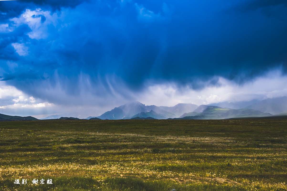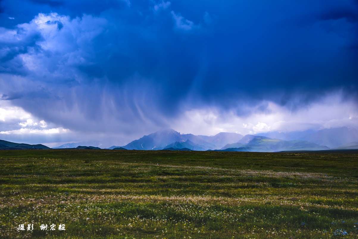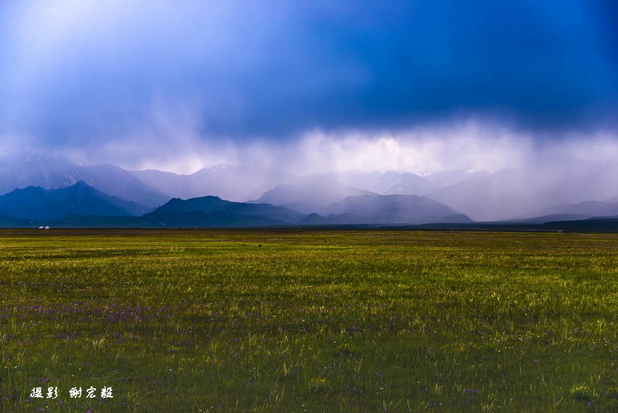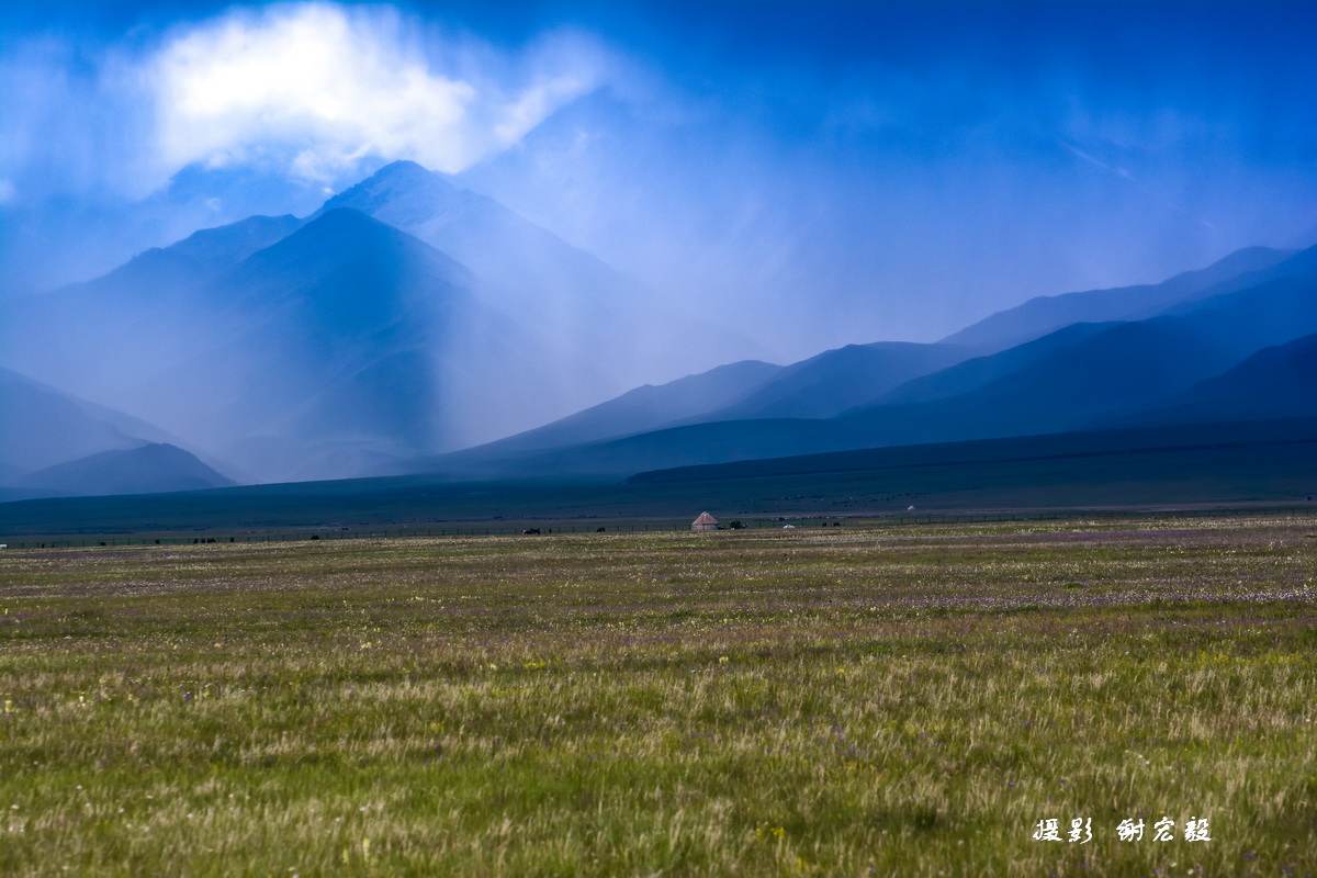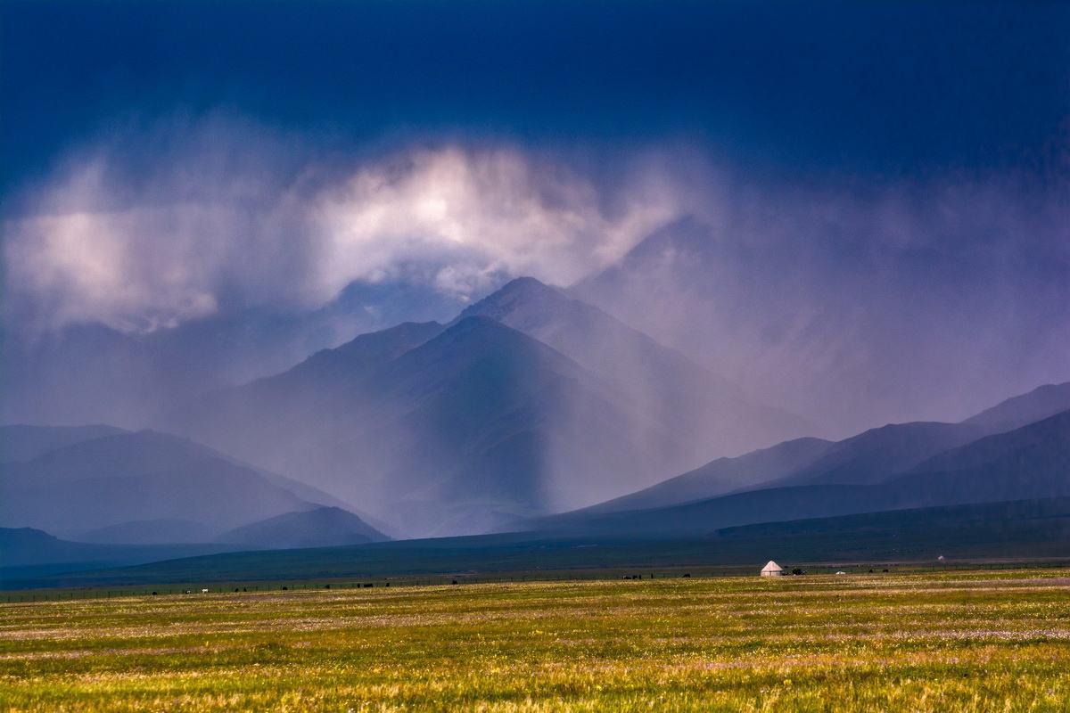 大西洋暖流碰撞天山的直接结果就是环湖一带多云雨,前一刻天空还朵朵白云,下一刻就有了远山上空的乌云翻滚,雨幕在山风操纵下变幻出莲花座般的模样。