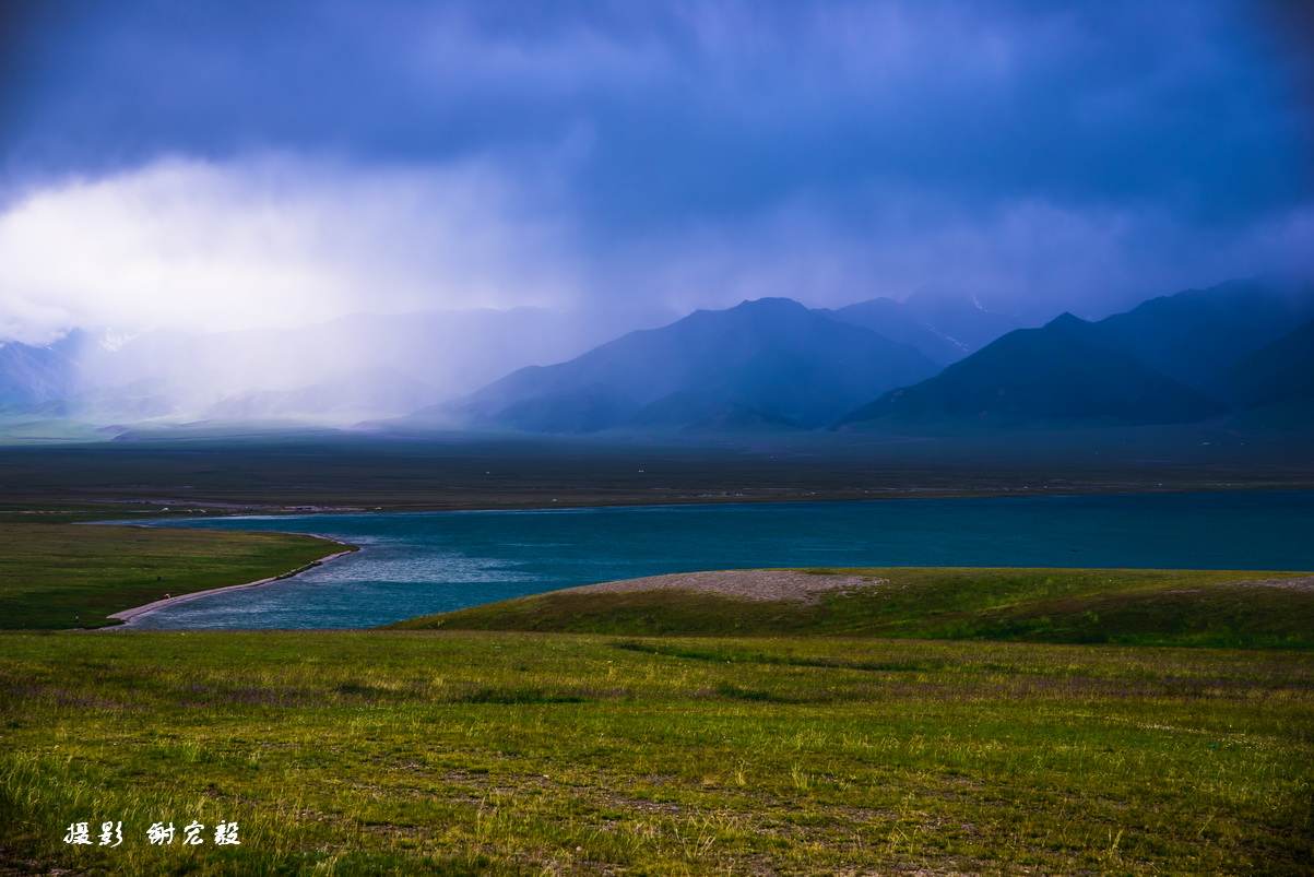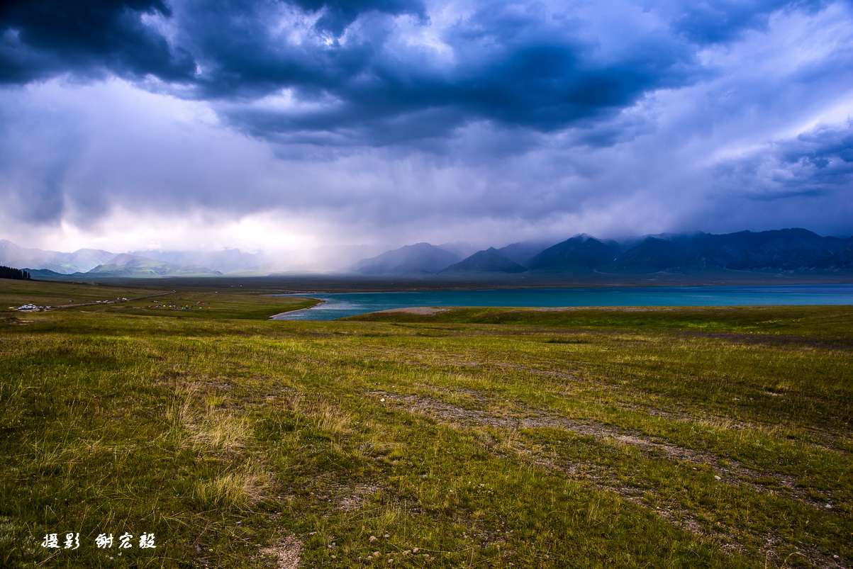 在乌云笼罩下,湖水的颜色也蓝得深沉。这就是赛里木湖展现的迷人一面。游客全不因天气的变化惊慌,大不了躲到车上,转眼天就会放晴。