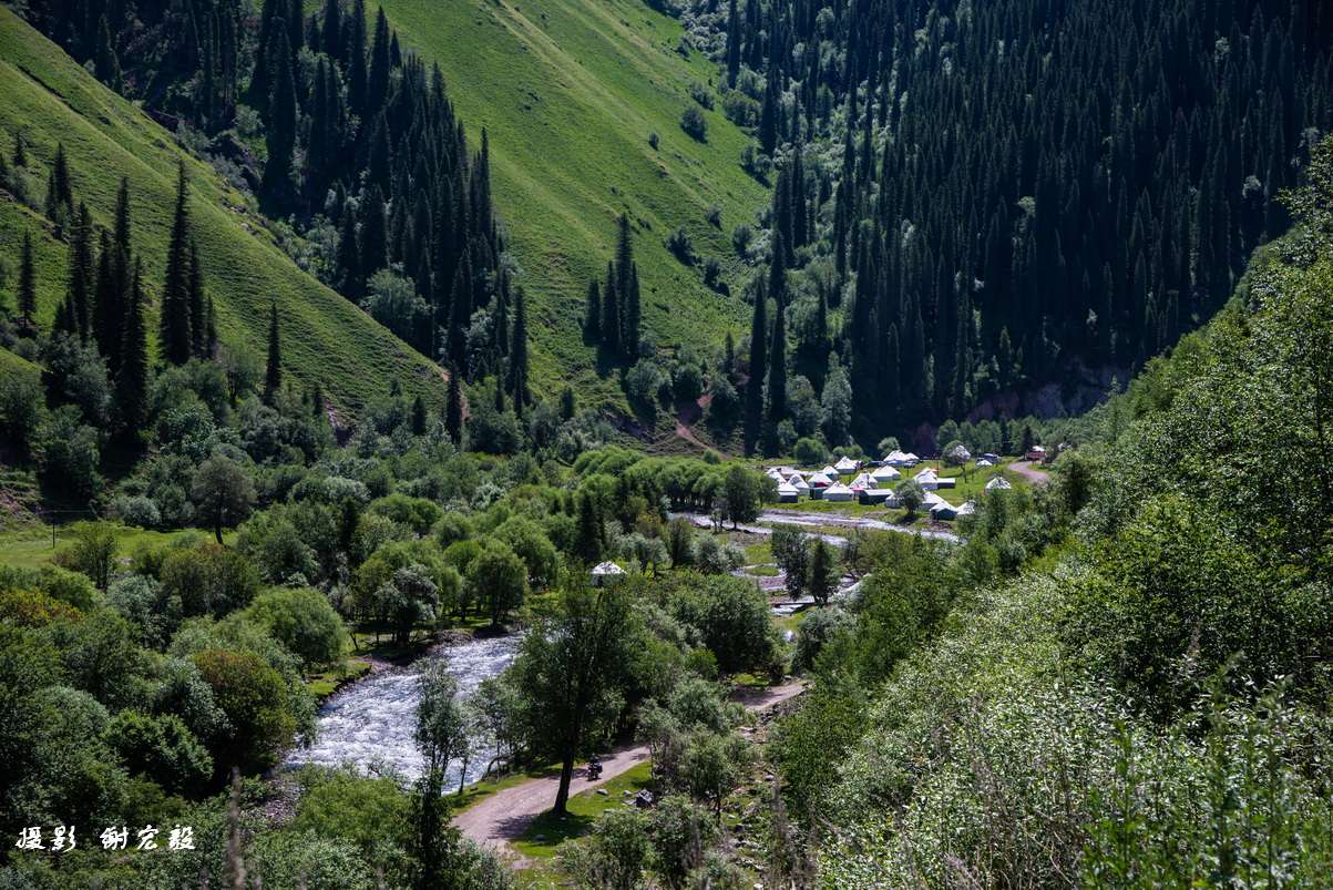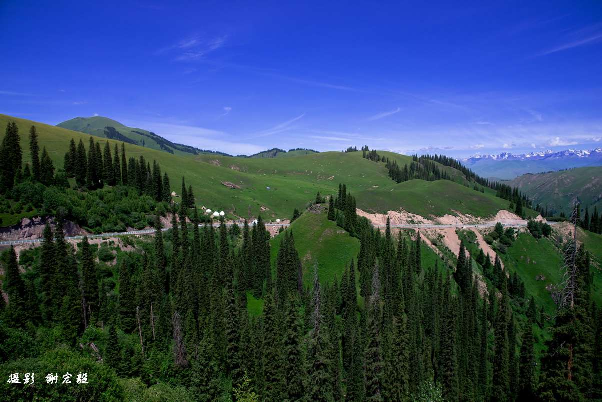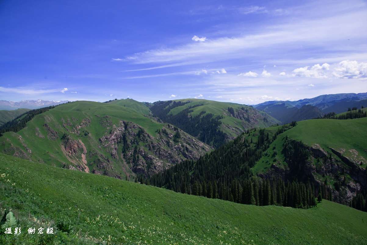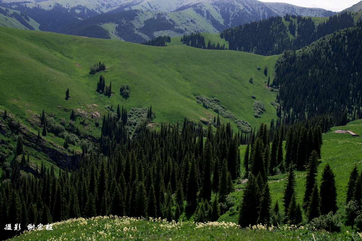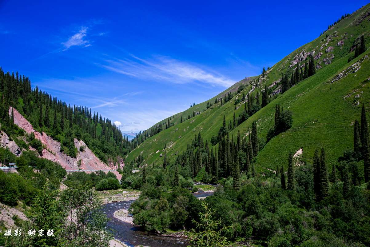 车子离开伊犁河谷拐进盘山公路,周围景色又改变了。公路边的河谷里云杉林立,清澈的雪山融水沿着小河欢快地流淌,往前汇入伊犁河。