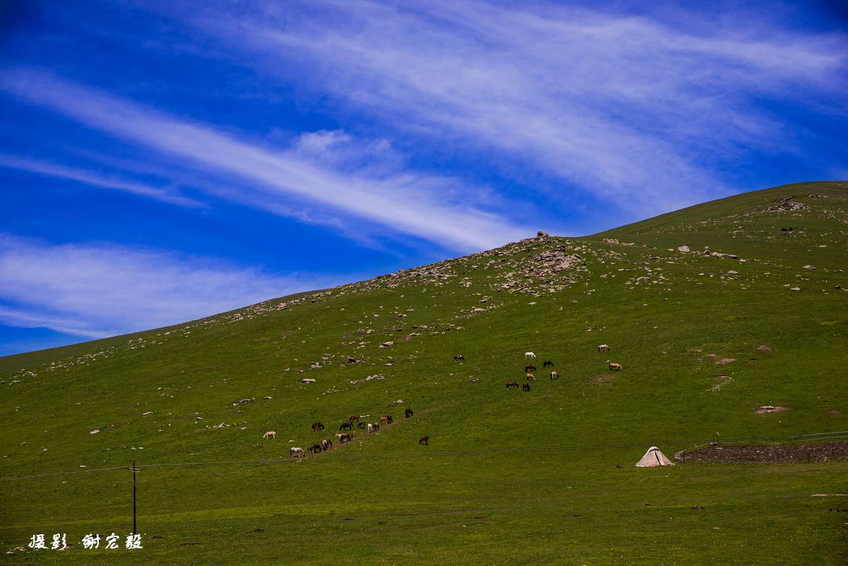 高空滚滚气流急,蓝天流云处处生。雨量充沛带来的直接效应便是随处可见的绿草,像丝绒般覆盖在山体表层。虽然不见姹紫嫣红的山花,仍可依稀见到淡黄的草花成片旺旺地开放。