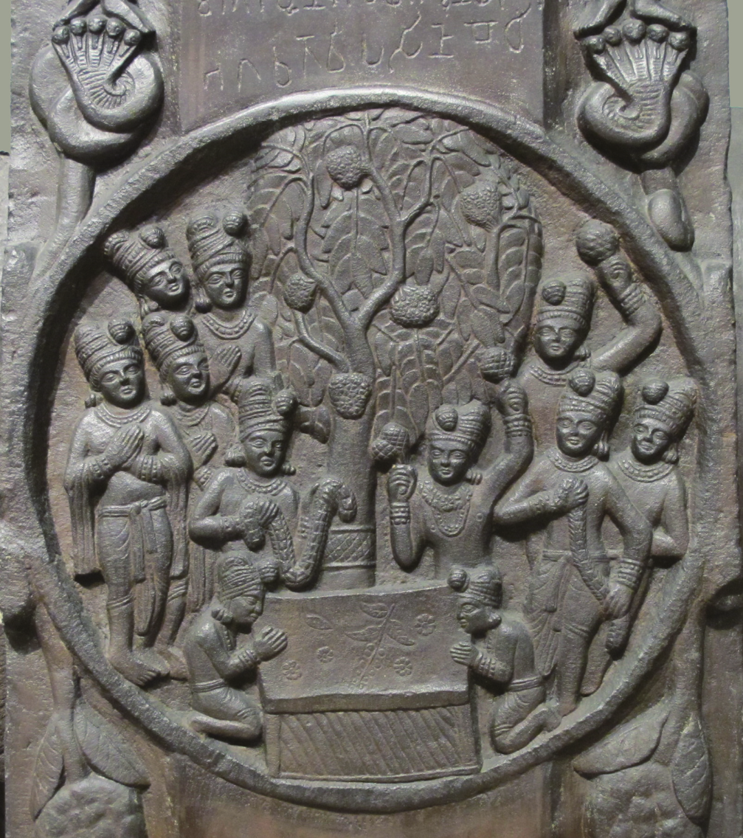 这件栏楯浮雕作品展现的则是人们在礼敬过去佛:果那葛马那佛。两名站着的信徒把花鬘挂在果那葛马那佛的菩提树上,前面的两名信徒则跪着礼敬象征佛陀的台座。图案上方,同样刻着布拉迷文的巴利语铭文:“跋葛瓦果那葛马那的菩提树”(Bhagavato Gonᾱgamanasa Bothi)。