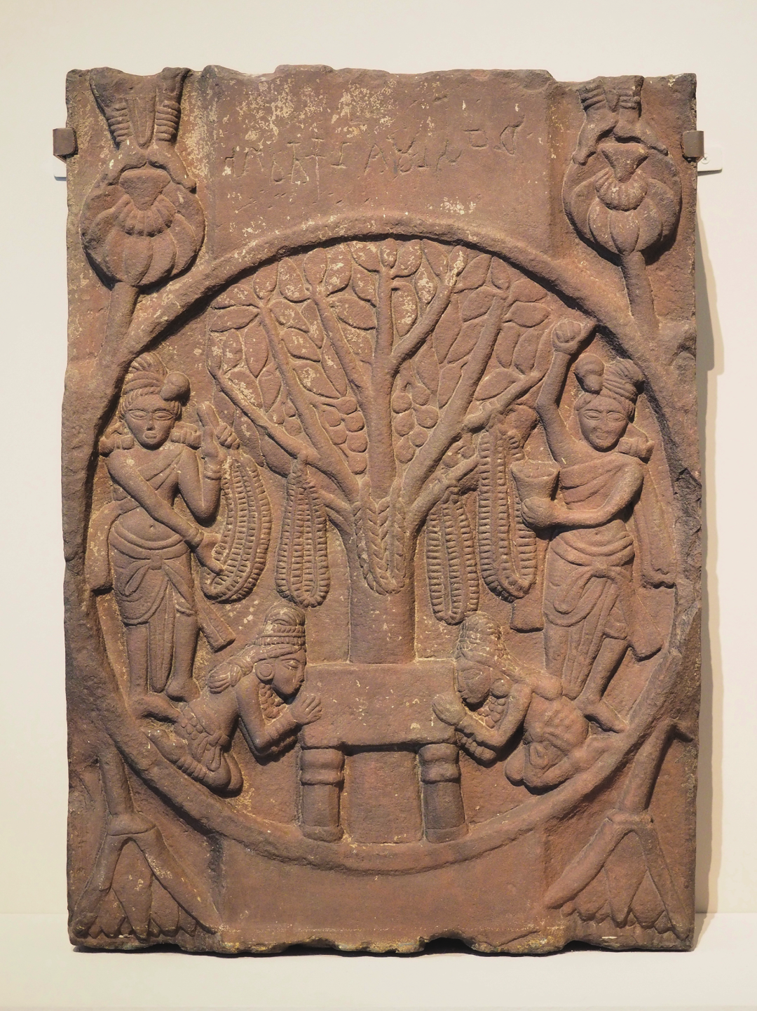 这是现藏于加尔各答印度博物馆(Indian Museum, Kolkada)中的一件巴尔胡特佛塔栏楯上的浮雕装饰。在图案的上方,有一行用西元前2世纪时通用的布拉迷文(Brᾱhmī)刻写着的巴利语铭文:“跋葛瓦维巴西的菩提树”(Bhagavato Vipasino Bothi)。