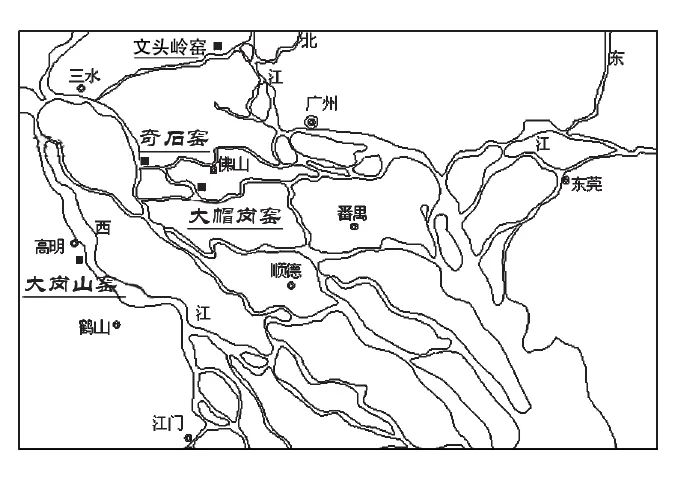 佛山石湾窑,素以生产烧造陶瓷著称。明清时期是石湾窑的繁荣与鼎盛阶段,至今石湾窑仍窑火不绝。往上追溯,唐宋时期佛山地区古窑址分布众多,其生产的陶瓷器亦独具特色。新中国成立以来,考古工作者先后在高明大岗山、禅城石湾大帽岗、南海小塘奇石和南海和顺文头岭等,发现多座唐宋时期的龙窑、馒头窑遗址,出土了众多陶瓷器。大岗山窑址位于高明区三洲乡塘尾村的山岗,北有西江河,试掘了两座龙窑,窑址年代为唐中晚期。大帽岗窑址位于禅城区石湾东部,临近东平河,水陆交通极为便利,古窑址掩埋在大帽岗西南山坡一带。1957年,当地民众在此挖壕沟时发现有古窑遗迹,广东省文管会作了初步调查;1962年,广东省博物馆对大帽岗窑址作了复查并试掘,在西部近岗处发现宋窑堆积,它还压在唐代窑址上面。奇石窑址位于南海区狮山镇小塘奇石村,临北江水道,倚山傍水,东南距石湾九公里。1976年,广东省考古人员对奇石窑址进行了考古调查与试掘。奇石窑址范围较广,主要集中在虎石山、大庙岗等几个山岗,绵延三、四公里,共有几十座唐宋时期的龙窑。文头岭窑址位于南海区里水镇和顺逢涌北面约一公里的山岗,南面近河,交通方便,窑址依山势修筑,遗物堆积丰富,揭开表土,就可捡到瓷片和窑具。这些古窑址均紧靠珠江支流,属于临江型选址,选择建在出海水运交通便捷的地方,具有非常明显的外销倾向。