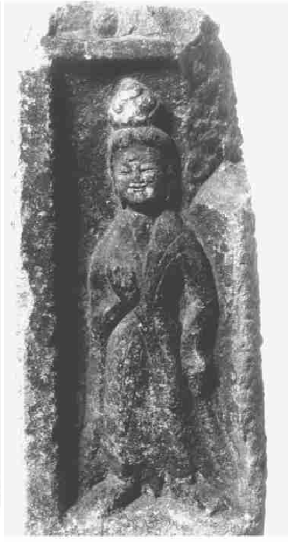 砂岩,浮雕,高54. 7厘米,宽22. 9厘米,有轻微风化皇作立长立形,菩萨像站立其中。头顶结肥大的高髻,溜肩,面带微笑,头发由额上中分,分于两鬓,垂至肩部。破帛交叉,左臂下垂,似手提裙据,左前臂举起,抚于胸前两腿分开,两脚呈外八字站立该菩萨装已汉化,但破帛交叉处并无穿璧由此推测,此龛像应是云冈二期至三期前段的作品。这一时期云冈石窟的龛形主要有圆拱形顶、銮形和屋形龛三种。从此龛像上部的残痕观察,上面原来雕有一禅定坐佛。菩萨头部略向右侧,由此推测,此龛像原来应是某一佛龛左侧的肋、侍菩萨像。