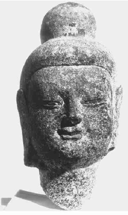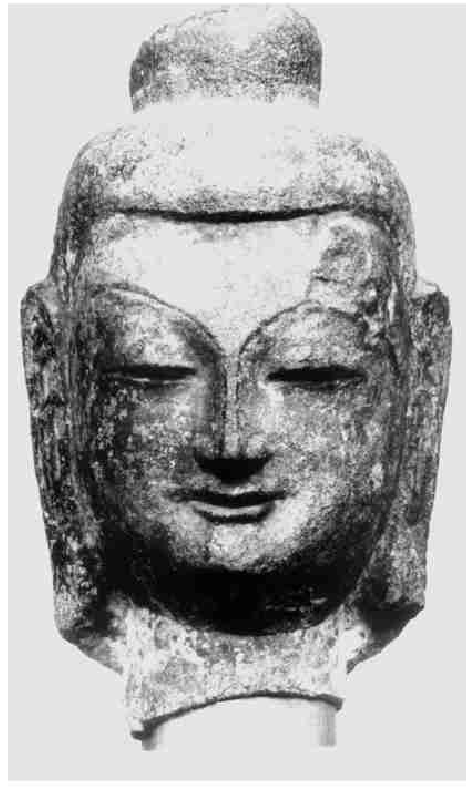 砂岩高41. 3厘米,肉髻,脸形瘦长,耳朵不及图十一和图十二两佛头双耳那样细长,外眼角稍有下垂,保存完好与云冈西部洞窟(20窟以西的小型洞窟)雕像风格一致,是云冈三期作品,雕凿于迁洛之后。