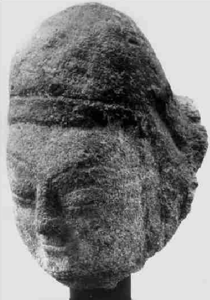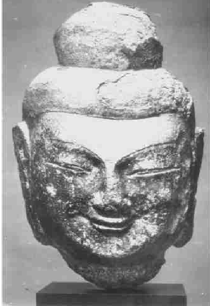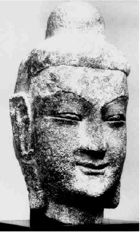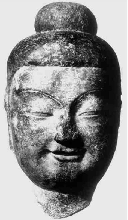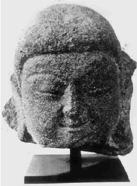 砂岩高3 8. 5厘米,肉髻,脸形比图十一所示佛头略显清秀耳细而长,鼻隆起,表情含蓄,与19窟诸像相似,是云冈石窟早期的作品,应出自昙耀5窟。