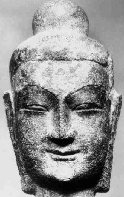 砂岩高49. 5厘米,小肉髻,宽额头,面相方圆,眉毛用两条流畅的阴刻线表现,嘴角上翘,面带微笑,雕刻简洁传神,为云冈二期作品中的精品,保存完好。