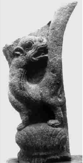砂岩,高浮雕高54. 5厘米,眼圆睁,口大张,脚下蹬束帛,作回头张望状。云冈石窟拱形龛两侧常雕虎、龙、鸟等动物,左右对称,两动物的身体后部上卷,形成皇嵋,造型流畅优美,其中带束帛的造型主要流行于二期的中部窟群,三期多无束帛,或将兽头简化,因此该石雕应是二期作品。