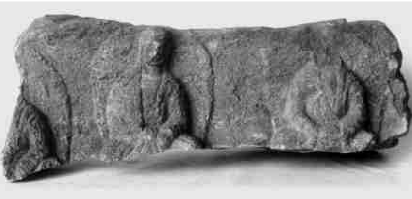 1926年入藏,砂岩,高13厘米。坐佛一列共三身,造型及服饰相同。皆残,仅中间一尊保存膝以上部么佛身着双领下垂袭装,身后有椭圆形背光。值得注意的是,三尊坐佛并不处于同一水平线上,而是呈一定的弧度分布。因此推测它应是背光或拱形龛龛嵋的一部么这类题材多见于云冈二、三期雕像中。此禅定坐佛的特征更接近云冈二期。