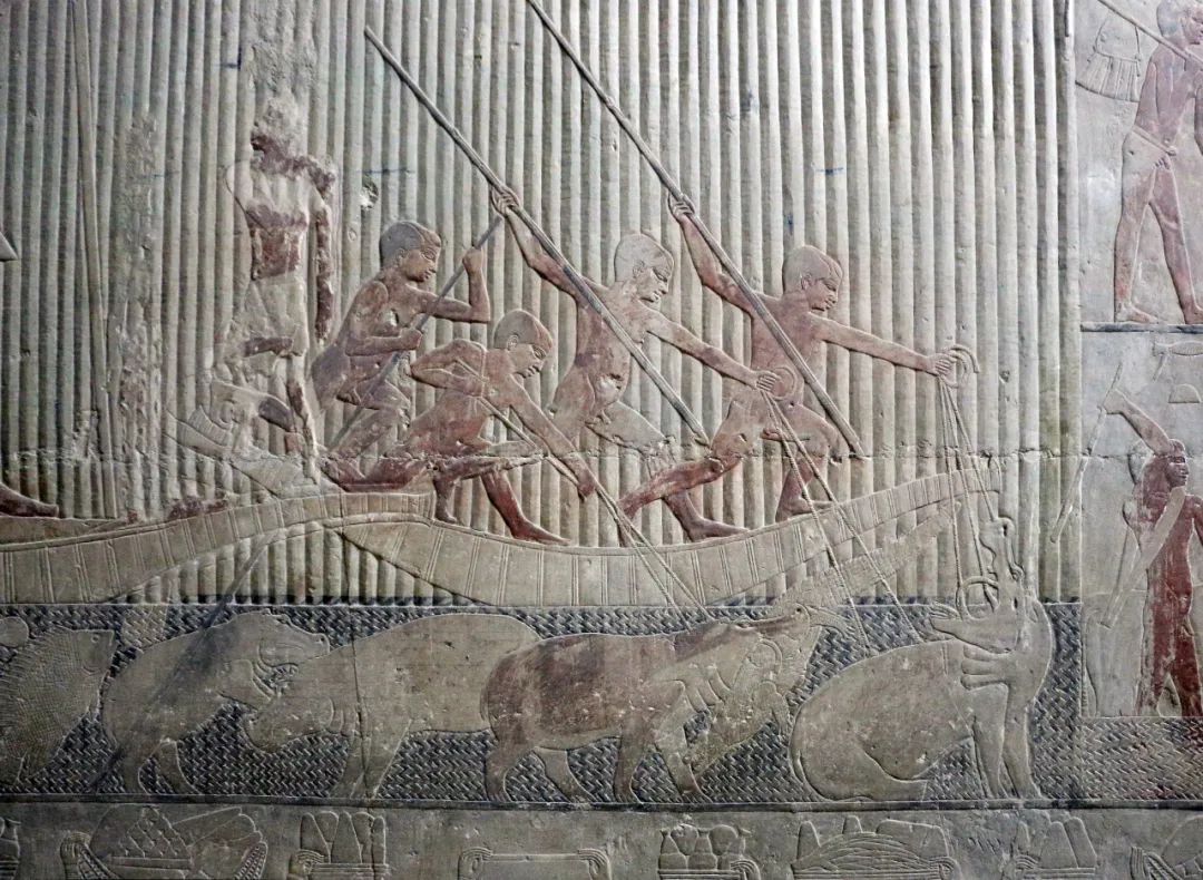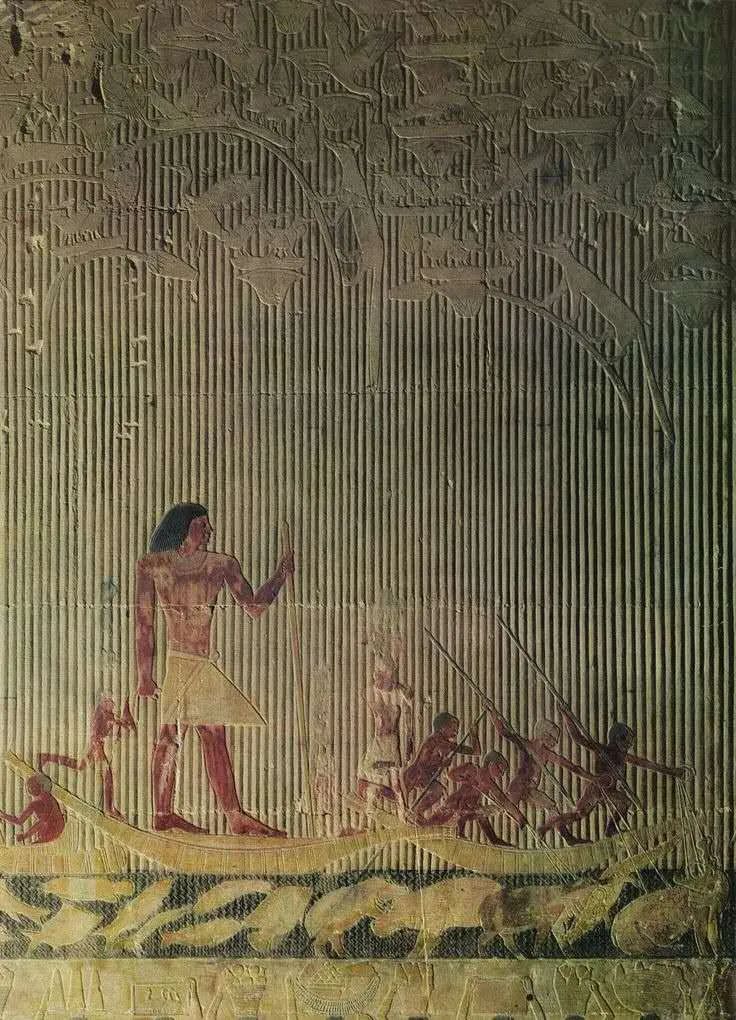 上面这个场景描绘的是提(Ti)与猎河马的人们。注意人物形象的大小代表社会等级而不是真实的大小。提(Ti)的形象极其程式化,而正在猎杀的男人们相对要生动许多,并且裸体。另一方面,为了表现动态场景,人物也相应地要做现实主义处理。