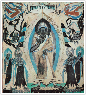 莫高窟第249窟说法图,位于北壁中部,西魏绘制。立佛居中,身着右袒袈 裟,右手扬掌,左手握衣,庄严肃立。两侧各二身菩 萨,着右袒袈裟,或半裸着裙。菩萨身段苗条,肢体柔软,姿态忸怩,显得温婉妩媚。佛上方高悬饰有兽头和双凤的华盖,垂挂玉佩羽葆装饰的流苏。华盖两侧流云中有四身飞天,上面的一对容貌清秀、身材修长,身穿大袖长袍,挥袖蜷腿,舞姿轻柔娇娜;下面的一对上身半裸披巾,下系长裙,手捧莲蕾,或作散花状,双脚倒垂头上,动作奔放刚健。图的下部有宝池莲花,其题材可看作是净土变的雏形。此图人物形象、动态、衣饰、华盖融有中原和西域两种风格。构图简练,设色素雅,形象生动,富于装饰性。