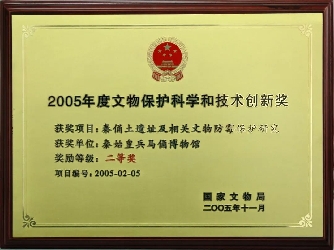 2003年11月,《秦俑土遗址及相关文物防霉保护研究》项目通过国家文物局科技专家组结项验收,并于2005年11月获得国家文物局文物保护科学和技术创新奖二等奖。