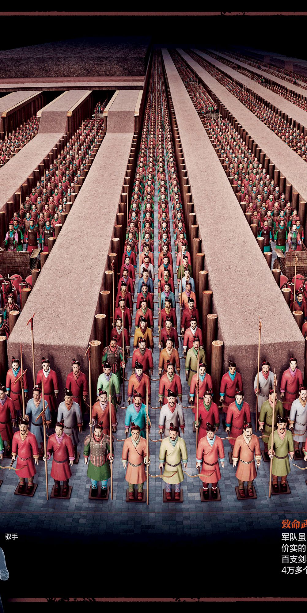 兵马俑气势恢宏,令人难忘,每年前来参观的游客多达几百万人。但这些兵马俑并不是为活人制作的,他们是秦始皇来世的战士——兵马俑列队整齐,俑坑之上放置横梁,再覆盖一层芦苇垫,最后埋在几吨重的黄土之下。如今,游客可以俯瞰一眼望不到尽头的兵马俑,而秦始皇本人却再无机会欣赏到这视觉盛宴。