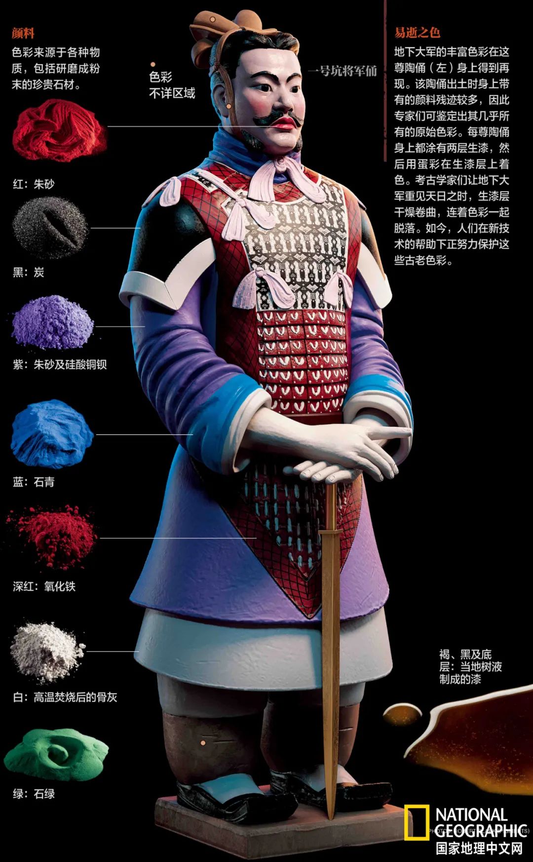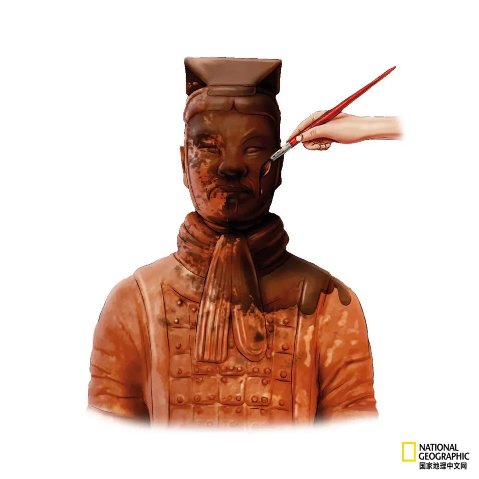 最后一步是为兵俑加上鲜艳的色彩;如今,很多兵佣只有鞋子、盔甲和头发上能看出漆。