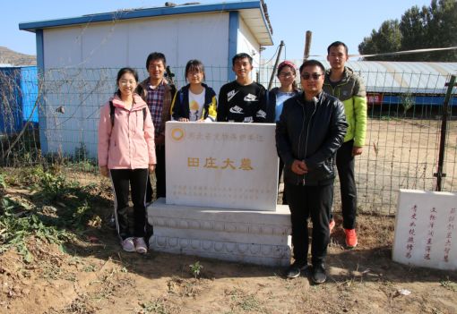 我们行至河边大坝,望着大沙河清澈的水流,在观察好最佳行进地点确认安全后,齐刷刷的脱掉了鞋子,换上了拖鞋。大家互相搀扶,平安渡河。然而,两位同学的拖鞋不慎被河水冲走了,但这两支拖鞋将随着南去的流水,去往无垠的远方。在微信步数增长到一万步之后,我们到达了第一个考察地点——田庄大墓。(由于涉及资料问题,在此就不公开啦,请大家多多期待田庄大墓发掘报告吧~)