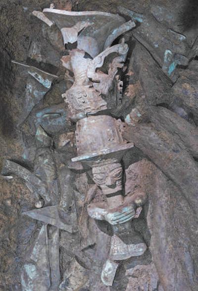 三星堆3号祭祀坑中的铜顶尊跪坐人像。图片来自王明峰