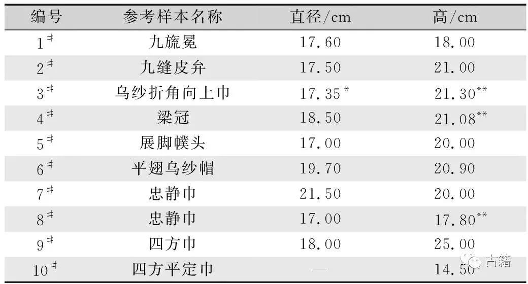 注:1#~7#数据来自《大羽华裳 明清服饰特展》[17],8#~10#数据依次来自《苏州虎丘王锡爵墓清理纪略》[18]、《江苏泰州明代刘湘夫妇合葬墓清理简报》[19]、《上海明墓》[20];*表示长径、短径均值,** 表示仅巾顶至巾底或冠底至冠顶高度(即除脑后两耳或两脚高度)。
