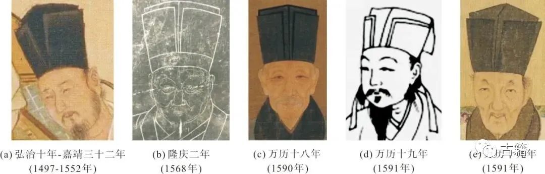 一说“求新”。《客座赘语》(1617年)中用“十余年变为二三年”,以年为单位记述妇女衣饰变化速度,在记述男性巾类首服时却用了“日异月新”[45]一词,可见相较之下男子巾式变化周期之快。笔者再以明朝中后期的东坡巾为例说明。图7(a)[46]为仇英(1497—1552年)《人物故事图·竹院品古》人物局部,可以看出巾式略高于明初期样式;图7(b)为现藏于常熟碑刻博物馆中隆庆二年(1568年)所制的《归氏四世像赞》人物局部,石刻人物所戴东坡巾的巾身增加布帛底部结构;图7(c)明代为万历十八年(1590年)所作的民间私人收藏的传世画处士栢塘陈公像,陈公佩戴的东坡巾体式相交隆庆二年的石刻像更高,巾身更瘦长;图7(d)[44]为明代万历十九年(1591年)明代刻本插图中戴此形东坡巾的士人形象,巾身又略有缩短,巾身前布帛多了一道装饰线,且巾后有一纱帛下垂;图7(e)[47]为万历十九年(1591年)明代沈俊所绘制的《陆文定人画册》人物局部,可见东坡巾身向上方隆起,但也不排除是透视原因。笔者认为以上举例的东坡巾虽巾式高低方面区分不明显,也无法考证绘者是否结合画中人物对巾式高低进行了自我调整,但临近年间及同年间的造型表现多样且无重复,这也能一定程度上证实明代中后期男子巾类造型结构变化流行频率之快、变化周期之短。