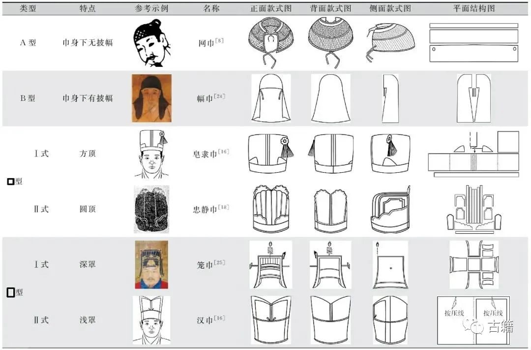 ①图片型,巾子正侧面基本呈正方形,其下又可分出二式:图片型Ⅰ式方顶;图片型Ⅱ式圆顶。