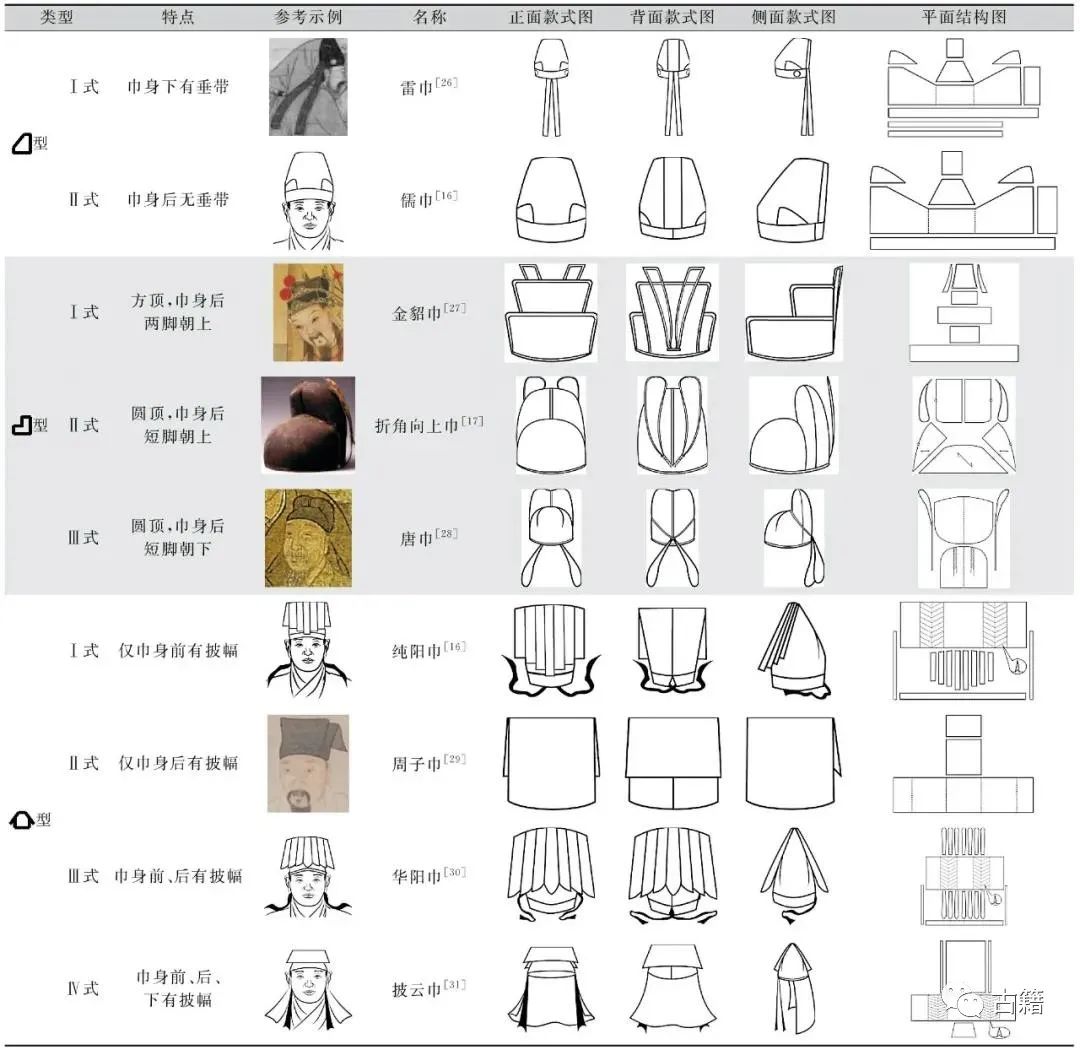 ④图片型,巾体正侧面呈阶梯状,其下又可分出三式:图片型Ⅰ式方顶巾身后两脚朝上;图片型Ⅱ式圆顶巾身后两脚朝上;图片型Ⅲ式圆顶巾身后两脚朝下。