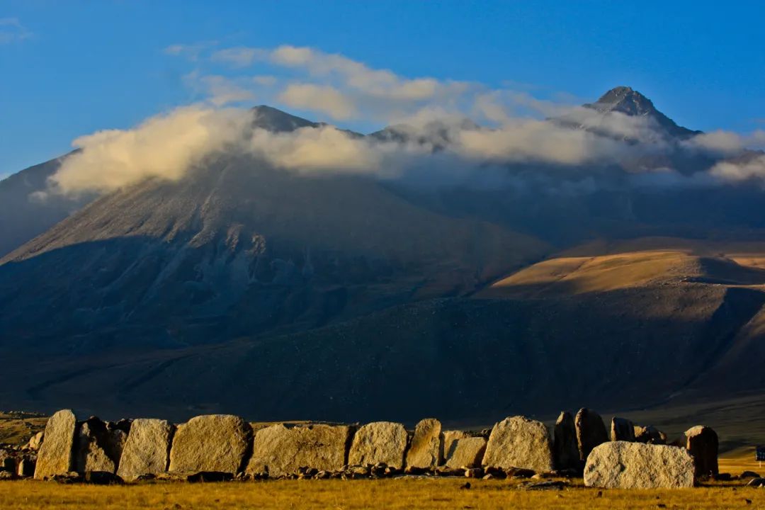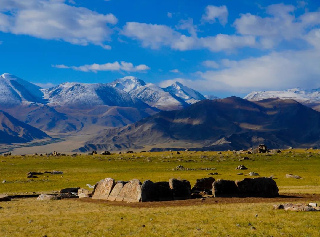 遗址与墓地所在的阿拉套山山前洪积扇,北高南低,高大的天山、低矮的丘陵与开阔的草场间次呈现,大型石板墓点缀其间,自然与人文和谐共处,美不胜收。