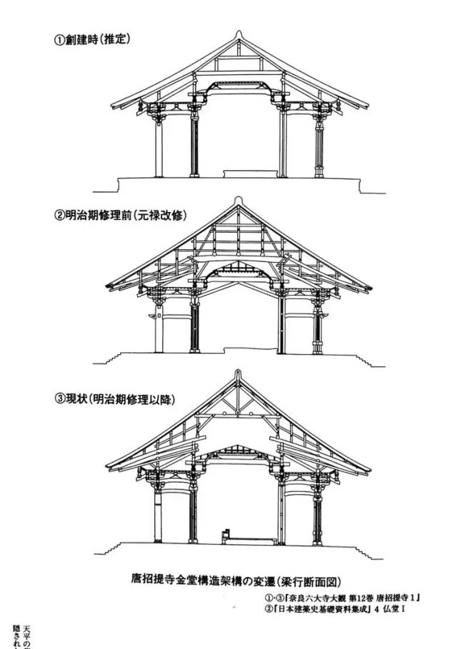 歷代修繕以後,唐招提寺金殿的梁架演變示意圖