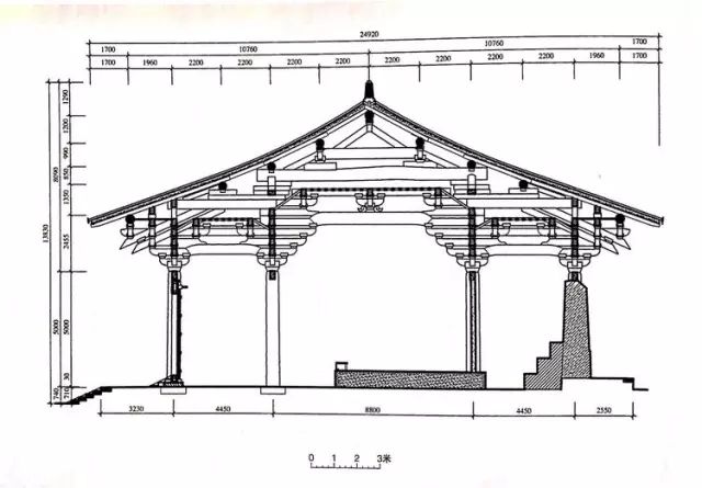 這個是晚建成大約100年的山西五臺山佛光寺東大殿,大小和形式與唐招提寺金殿幾乎類似,都是面闊七間,進深四間。只是柱頭斗拱和補間斗拱都比唐招提寺金殿來的複雜。