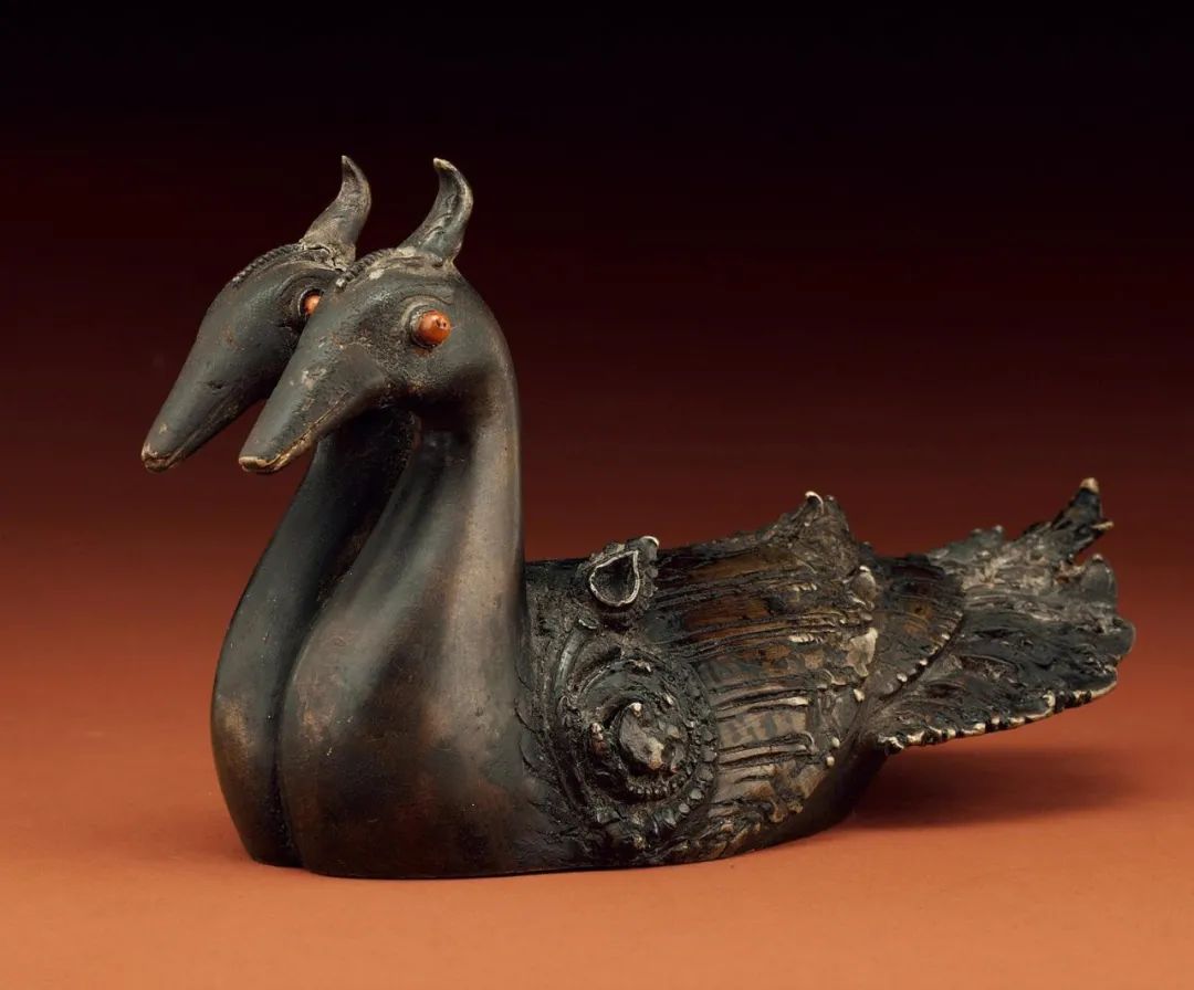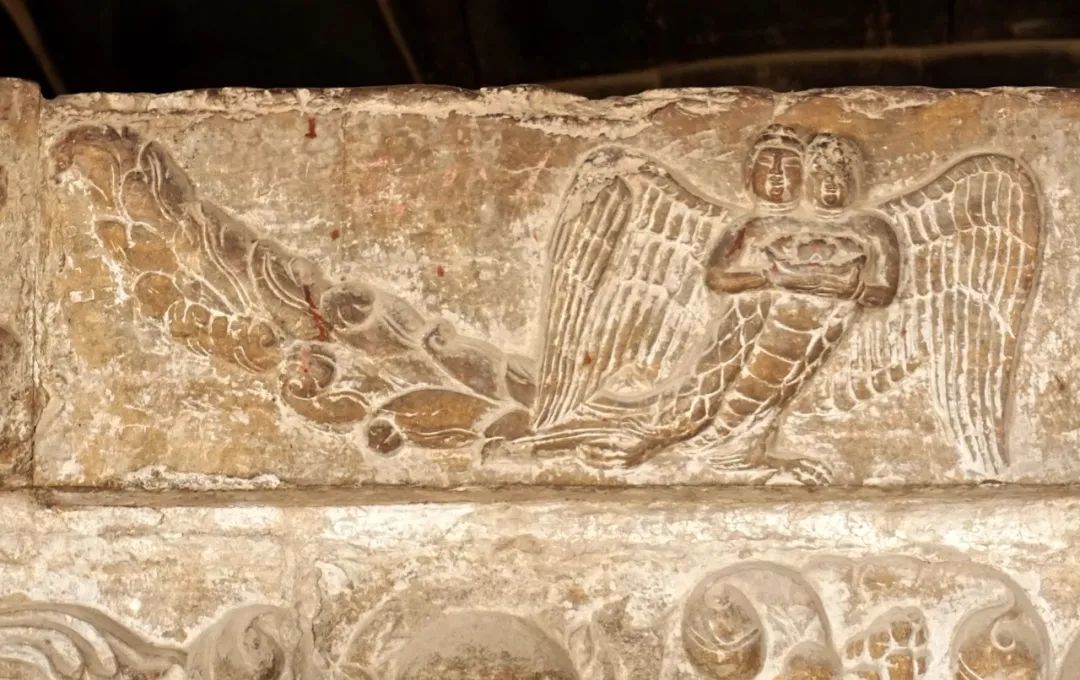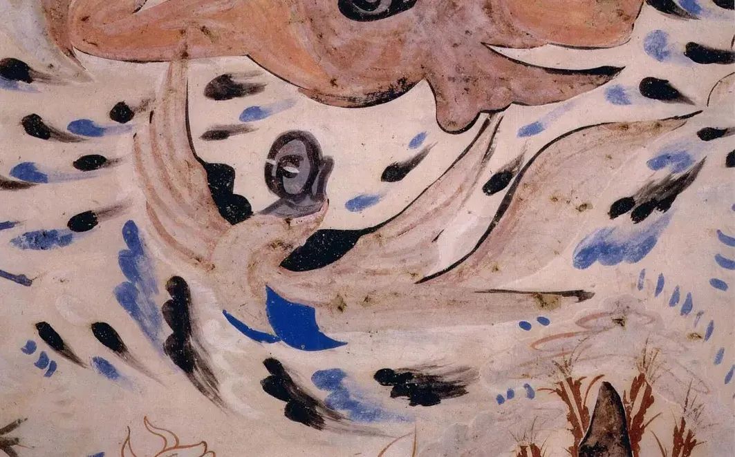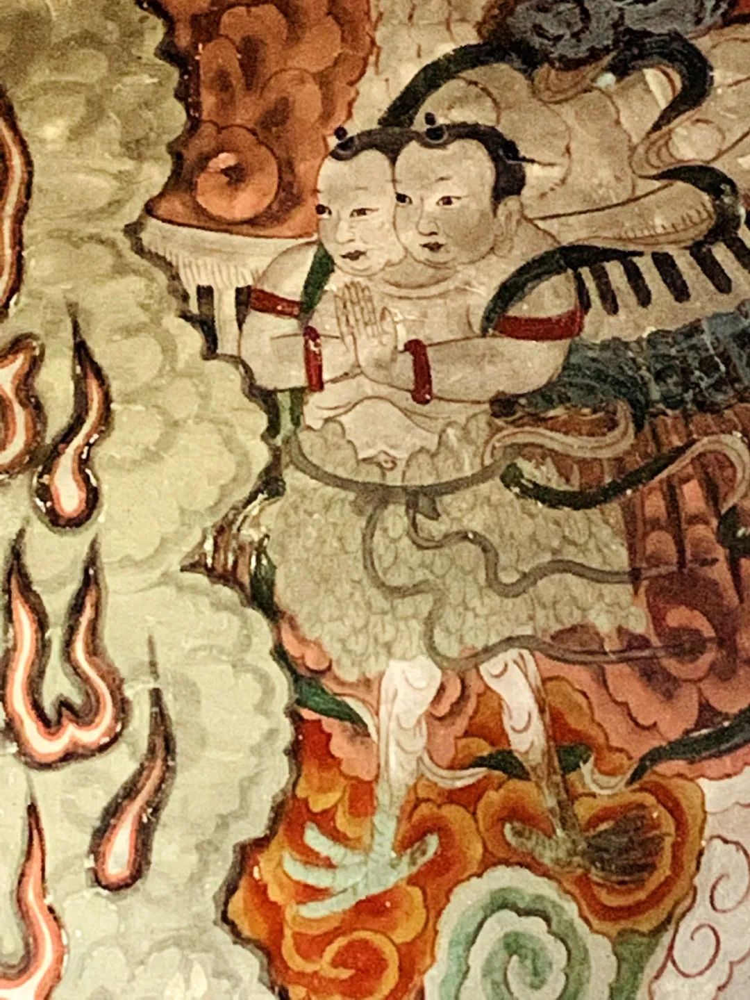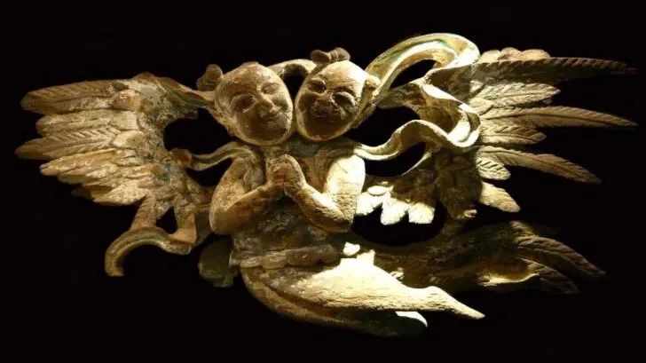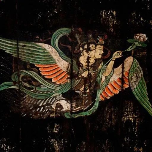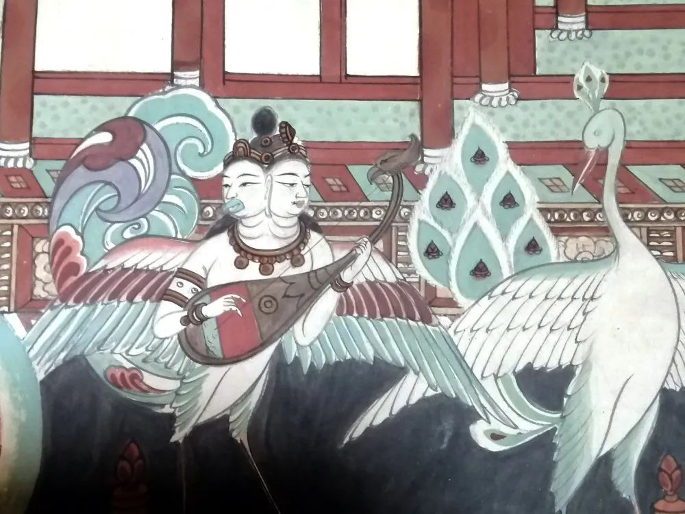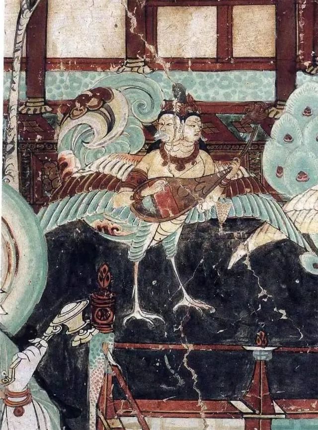 佛经中的共命鸟,头的部分为一雄一雌,两头共用一个身体。共命之鸟的形象变化很大,既有双头凤凰或者双头鹰形象的,也有上半身是人下半身是鸟的,有唱歌的也有弹奏琵琶伎乐天形象的,在佛教壁画中共命鸟常常是供养人的角色供养诸佛。