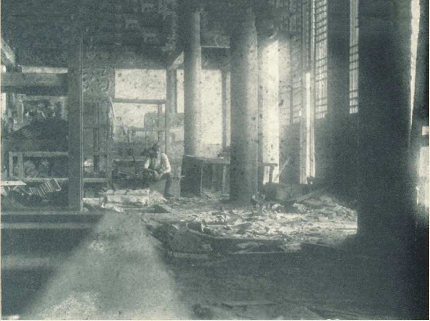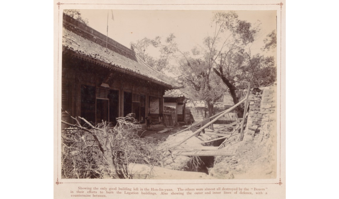 义和团与英军交战中翰林院唯一一栋幸存的建筑——敬一亭光绪二十六年(1900),仅存的600余册《永乐大典》再次遭遇灭顶之灾,义和团从翰林院一侧攻打英国使馆,双方发生激战,战乱中焚毁了翰林院库房,导致部分《永乐大典》化为灰烬。后八国联军入侵北京,幸存的《大典》被当做砖石,用来支垫军用物资以及构筑战壕、填平沟渠,甚至被用来遮蔽弹雨,《永乐大典》再遭破坏。至宣统元年(1909),翰林院已仅剩区区64册《永乐大典》。1900年翰林院被烧及书籍被毁之后的情景