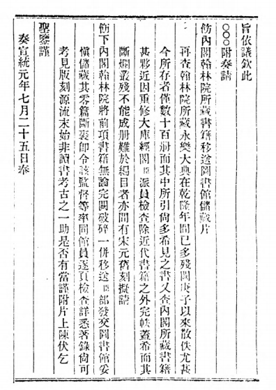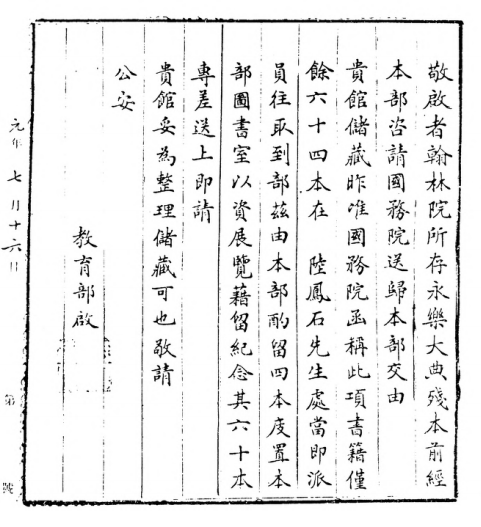 再查翰林院所藏《永乐大典》,在乾隆年间已多残缺。庚子以来,散佚尤甚。今所存者,仅数十百册。而其中所引,尚多稀见之书……拟请饬下内阁翰林院,将前项书籍,无论完阙破碎,一并移送臣部,发交图书馆妥慎储藏……是否有当,谨附片上陈。