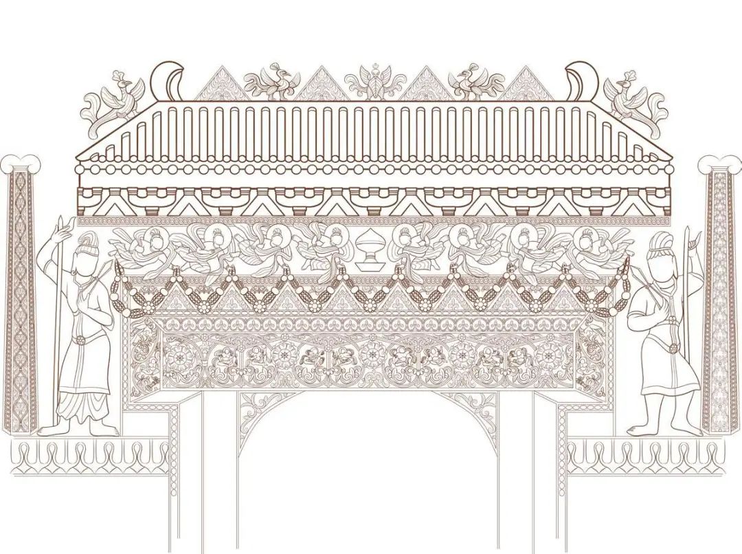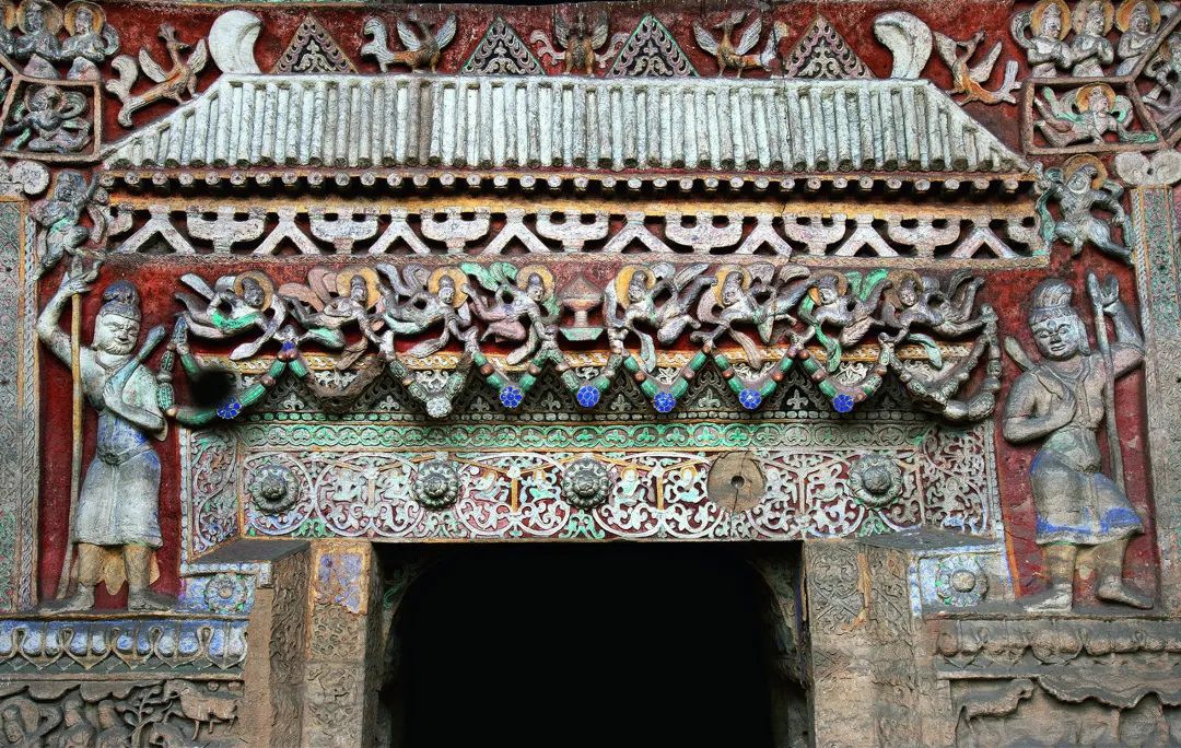 龛是供奉佛像、神位的阁子,称为佛龛或神龛。楣即门框上的横木,称为门楣。在佛龛的龛额上部位进行各种形式的装饰,这种装饰图案就称为“龛楣”。