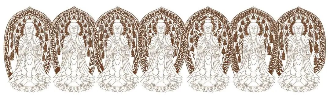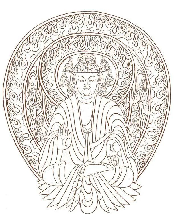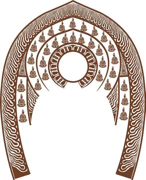 背光是佛教造像中不可或缺的重要组成部分之一,象征佛和菩萨的智慧之光、祥瑞之光。佛“三十二相”中的“常光相”,表示佛身常放光明,普照一切。云冈石窟佛像的背光包括头光和身光两部分,菩萨、弟子像只有“头光”而无“身光”。头光多为圆形,也有桃形,多以莲瓣纹、化佛、忍冬纹、火焰纹样等组成。身光多为舟形,主要有火焰形肩焰、飞天、化佛、化生童子、供养天人、忍冬纹、火焰纹等。云冈石窟里的背光图案,彰显了独特的北魏皇家风格,如第20窟主佛背光,由头光与身光两部分组成。头光由内向外依次为双瓣莲花纹、入定式坐佛、火焰纹等三重装饰纹样。身光直接通向窟顶,依次为火焰式肩焰、供养天人、入定坐佛、火焰纹等四重装饰纹样。中期,以云冈第6窟中心塔柱上层的立佛身光和13窟的七立佛的身光极具特色。审美意境,时代性、地域性和民族性蕴含于其中。