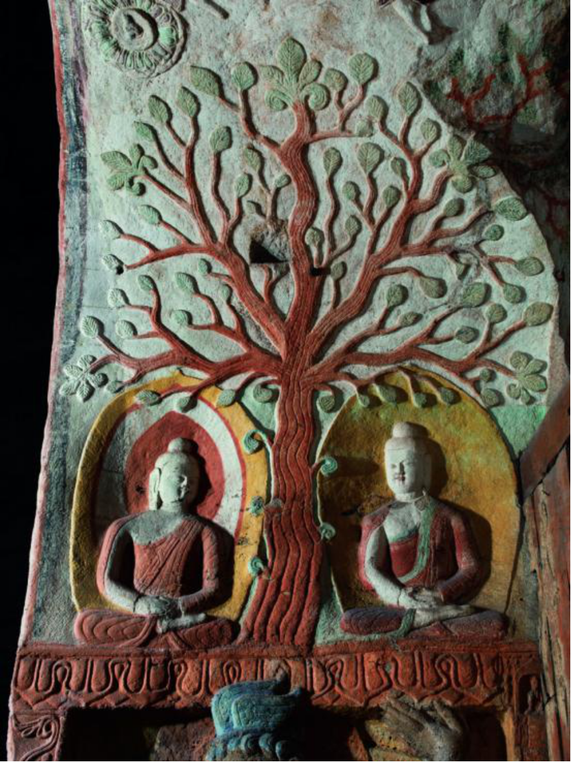 云冈的圣树表现,分布较广,石窟中常见雕刻题材是二佛并坐与菩提树一同出现。以云冈第五窟中的菩提树为例,树冠呈椭圆形,枝叶扶疏,具长柄,浓荫覆地,主干较粗,表面裂成数条深沟,提炼概括的手法极为讲究,删繁就简、疏密、线条与面结合,形式感极强,其装饰手段极尽精妙。38窟的“音乐树”,为佛经中描绘的七宝树。这些蕴含佛意的树木,大多夹杂在本生、佛传故事中,或呈现在壁面、明窗等部位,如第8窟、12窟。值得关注的还有6窟、9、10窟、11窟的无忧树、思维树等。圣树形象,树形优美,图案化因素包含其中,枝叶茂盛、遮天蔽日,给人以神圣、肃穆之感,是对于佛国具体场景的表现。