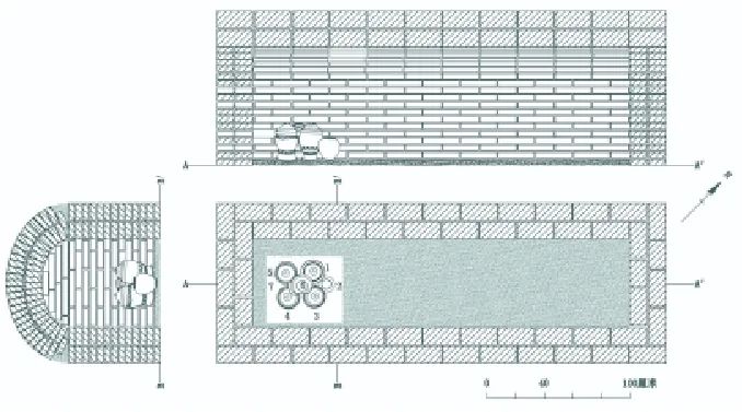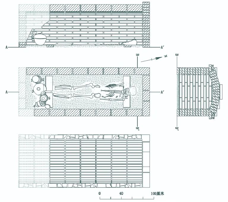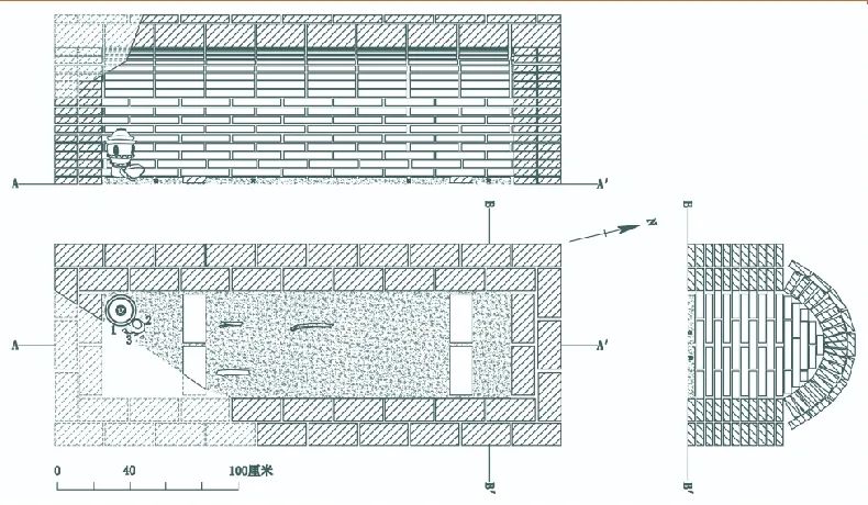 M3 东距M2约23米,方向45°。墓坑口距地表100厘米,长355、宽152,底长345、宽142厘米,深158厘米。墓顶距坑口50厘米。墓室长315、宽112、高108厘米。双层墓壁,两层之间没有咬合,均为单砖直铺,错缝叠砌。四壁有白灰痕。墓顶为双层券,使用条形砖和刀形砖混合券顶,对缝券拱。券顶白灰填缝。条形砖长25.5,宽12,厚4厘米,刀形砖长25.5,宽12,厚2~4厘米(图4)。
