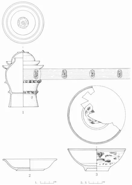 1.陶坛 2.青白瓷盘 3.青花瓷碗