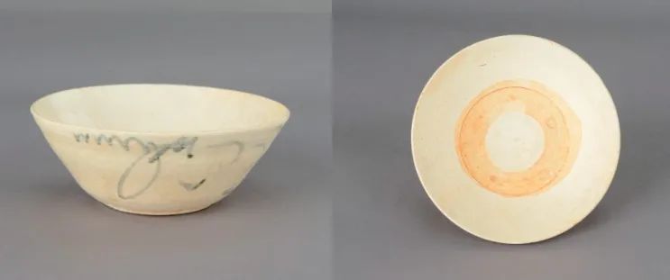 青花瓷碗 2件。M2:6,敞口圆唇,弧壁,微圜底,圈足。通体施青白釉。外壁口沿、下腹部及圈足饰弦纹,中部绘青花纹饰。内壁口沿、底部饰双弦纹,内底绘寿字纹。口径14.2、底径5.5、高5.5厘米(图6:3;图版:9)。M2:7,敞口方唇,微弧壁,平底,圈足。外壁绘青花纹饰,呈色泛灰。内底有色圈。口径15.3、底径6.4、高5.8厘米(图6:4;图版10)。M2:7扣置于M2:6上装乘于陶钵M2:3内。